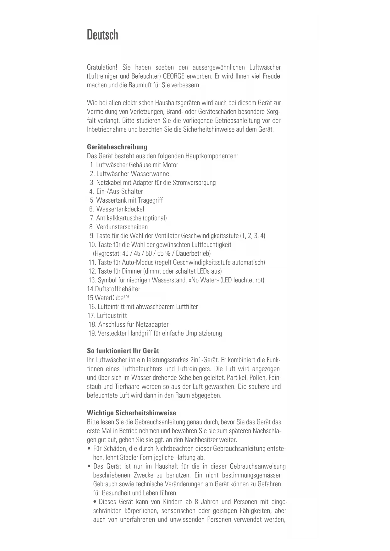 - Im Falle einer Reparatur müssen folgende Punkte beachtet werden, bevor das Gerät verschickt oder zum Händler gebracht wird: das Wasser im Ge- rät komplett ausleeren (Wasserwanne und allfälliger Wassertank), etwa- ige Filterkassetten und/oder Antikalkkartuschen entfernen und das Gerät vollständig trocknen lassen. Geräte mit Restwasser werden während des Transports beschädigt. Die Garantie erlischt in diesem Falle. Entsorgung Die europäische Richtlinie 2012 / 19 / CE über Elektro- und Elektronik-Alt- geräte (WEEE) verlangt, dass elektrische Haushaltsgeräte nicht über den Restmüll oder sonstigen Haushaltsabfall entsorgt werden dürfen, sondern an Sammelpunkten für das Recycling von elektrischen und elektronischen Geräten abgegeben werden müssen. So können die Verwertung der ent- haltenen Materialien optimiert und ihre Auswirkungen auf die menschliche Gesundheit und die Umwelt reduziert werden. Das durchgestri- chene Abfalltonnensymbol auf dem Produkt erinnert Sie an diese Verpflichtung. Bitte fragen Sie bei Ihrer Gemeindeverwaltung nach der zuständigen Entsorgungsstelle.Technische Daten Nennspannung DC 12 V Nennleistung 3 – 23 W Befeuchtungsleistung bis 400 g/h Abmessungen 315 x 418 x 215 mm (Breite x Höhe x Tiefe) Gewicht 5.1 kg Wasserkapazität 3.2 Liter Schalldruckpegel 27 – 48 dB(A) Erfüllt EU-Vorschrift CE / WEEE / RoHS / EAC Technische Änderungen vorbehaltenFélicitation ! Vous venez d‘acheter le superbe laveur d’air (purificateur et humidificateur d’air) GEORGE. Nous espérons que cet appareil vous donnera entière satisfaction et améliorera l’air intérieur pour vous. Comme pour tous les appareils ménagers électriques, il est important d‘entretenir cet appareil correctement afin d’éviter les blessures, les incen- dies ou les dommages. Veuillez lire attentivement le présent mode d’emploi avant la mise en service et respecter les conseils de sécurité indiqués sur l’appareil. Description de l’appareil L’appareil est composé des éléments principaux suivants:
