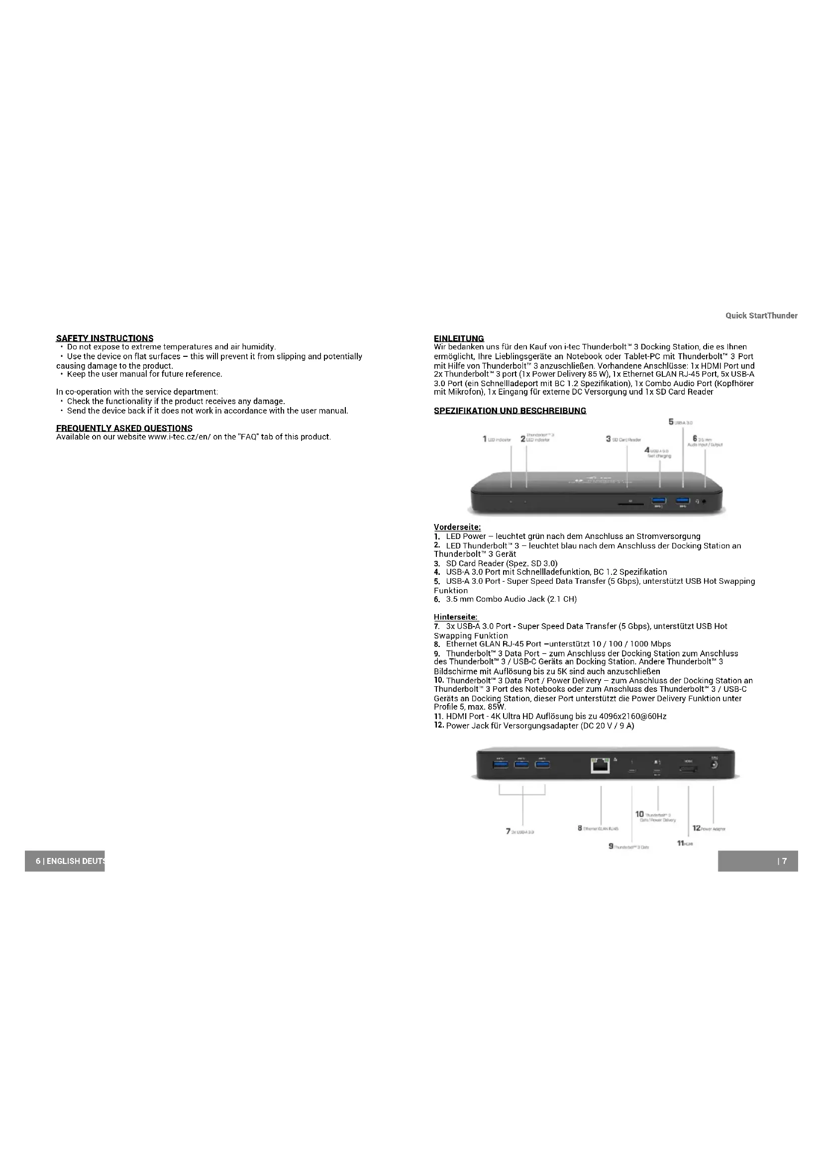 Available on our website www.i-tec.cz/en/ on the "FAQ" tab of this product. EINLEITUNG Wir bedanken uns für den Kauf von i-tec Thunderbolt™ 3 Docking Station, die es Ihnen ermöglicht, Ihre Lieblingsgeräte an Notebook oder Tablet-PC mit Thunderbolt™ 3 Port mit Hilfe von Thunderbolt™ 3 anzuschließen. Vorhandene Anschlüsse: 1x HDMI Port und 2x Thunderbolt™ 3 port (1x Power Delivery 85 W), 1x Ethernet GLAN RJ-45 Port, 5x USB-A