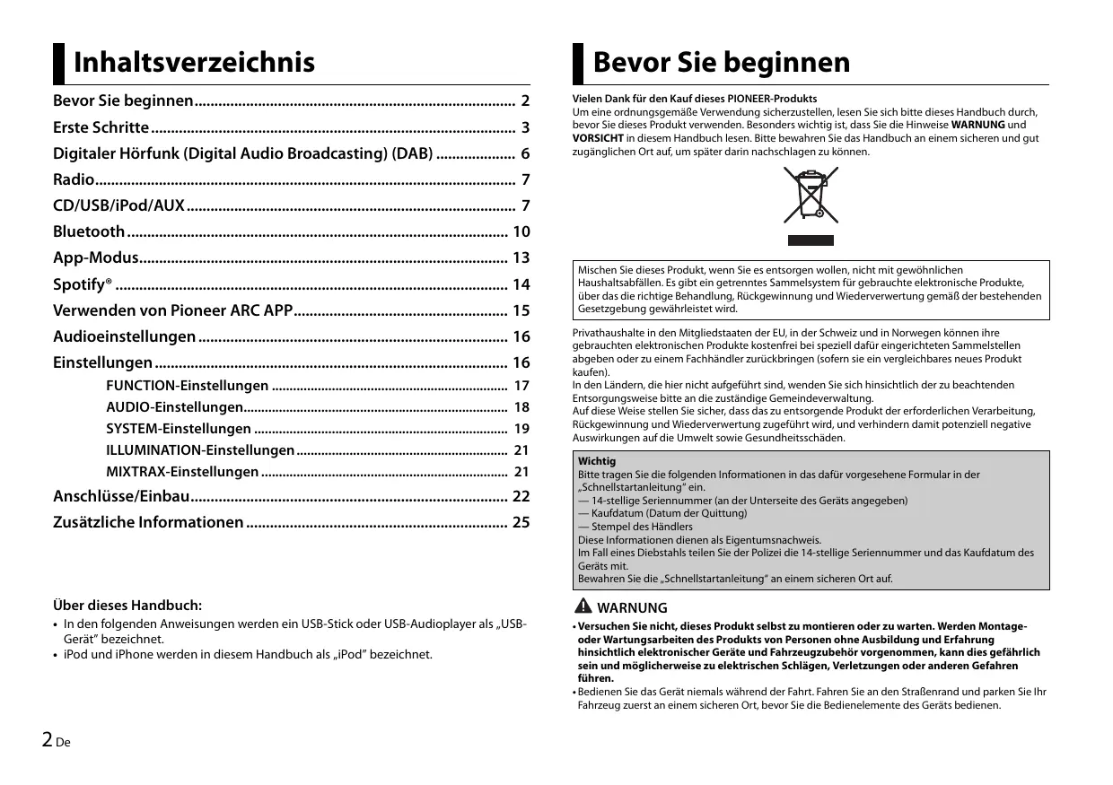 - iPod und iPhone werden in diesem Handbuch als „iPod” bezeichnet. 2 De Mischen Sie dieses Produkt, wenn Sie es entsorgen wollen, nicht mit gewöhnlichen Haushaltsabfällen. Es gibt ein getrenntes Sammelsystem für gebrauchte elektronische Produkte, über das die richtige Behandlung, Rückgewinnung und Wiederverwertung gemäß der bestehenden Gesetzgebung gewährleistet wird. Privathaushalte in den Mitgliedstaaten der EU, in der Schweiz und in Norwegen können ihre gebrauchten elektronischen Produkte kostenfrei bei speziell dafür eingerichteten Sammelstellen abgeben oder zu einem Fachhändler zurückbringen (sofern sie ein vergleichbares neues Produkt kaufen). In den Ländern, die hier nicht aufgeführt sind, wenden Sie sich hinsichtlich der zu beachtenden Entsorgungsweise bitte an die zuständige Gemeindeverwaltung. Auf diese Weise stellen Sie sicher, dass das zu entsorgende Produkt der erforderlichen Verarbeitung, Rückgewinnung und Wiederverwertung zugeführt wird, und verhindern damit potenziell negative Auswirkungen auf die Umwelt sowie Gesundheitsschäden. Wichtig Bitte tragen Sie die folgenden Informationen in das dafür vorgesehene Formular in der „Schnellstartanleitung“ ein. — 14-stellige Seriennummer (an der Unterseite des Geräts angegeben) — Kaufdatum (Datum der Quittung) — Stempel des Händlers Diese Informationen dienen als Eigentumsnachweis. Im Fall eines Diebstahls teilen Sie der Polizei die 14-stellige Seriennummer und das Kaufdatum des Geräts mit. Bewahren Sie die „Schnellstartanleitung“ an einem sicheren Ort auf. WARNUNG