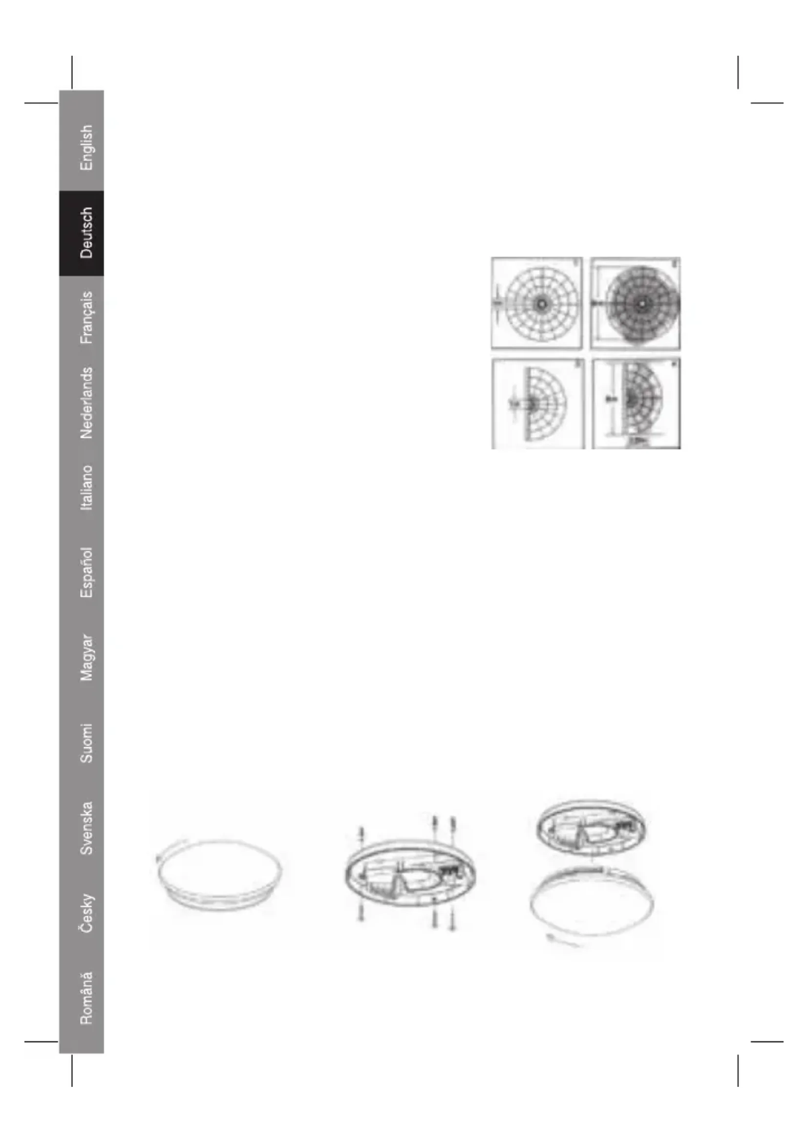 Abb. 3).2 Technische Daten: Wattzahl: 60 W/E27 Stromversorgung: 220-240 V~, 50/60 Hz Installation: Innen, Wand-/Deckenmontage HF-System: 5,8 GHz CW Radar, ISM-Band Übertragungsleistung: <10 mW Erkennungswinkel: 360°, 160° Reichweite: 1-8 m (Durchmesser), einstellbar Zeiteinstellung: 5 Sek. bis 15 Min. Lichtsteuerung: 2~2.000 LUX Stromverbrauch: ungefähr 0,9 W Anschluss Beleuchtung Verbinden Sie N, L mit der Stromversorgung; Erkennungseinstellung (Empndlichkeit) Reichweite ist der Begriff, der verwendet wird, um den Durchmesser des mehr oder weniger kreisförmigen Erkennungsbereichs zu beschreiben, der auf dem Boden erzeugt wird, wenn das Sensorlicht in einer Höhe von 2,5 m installiert ist. Drehen Sie die Reichweitensteuerung entgegen dem Uhrzeigersinn, um die minimale Reichweite auszuwählen (ungefähr 1 m Durchmesser) und drehen Sie diese im Uhrzeigersinn, um die maximale Reichweite auszuwählen (ungefähr 8 m Durchmesser). Zeiteinstellung Das Licht kann so eingestellt werden, dass es für einen Zeitraum von etwa 5 Sekunden (vollständig entgegen dem Uhrzeigersinn drehen) bis maximal 15 Minuten (vollständig im Uhrzeigersinn drehen) eingeschaltet bleibt. Wenn eine Bewegung erkannt wird, bevor dieser Zeitraum abgelaufen ist, wird der Timer neu gestartet. Es ist empfehlenwert, dass Sie zum Einstellen des Erkennungsbereichs und für das Durchführen des Lauftests die kürzeste Zeit einstellen. HINWEIS: Wenn sich das Licht ausschaltet, dauert es ungefähr 1 Sekunde, bevor der Bewegungsmelder erneut in der Lage ist, eine Bewegung zu erkennen. Wenn dieser Zeitraum verstrichen ist, wird das Licht nur in Reaktion auf eine Bewegung eingeschaltet. Lichtsteuerungs-Einstellung Der gewählte Schwellenwert für die Lichtreaktion kann stufenlos von etwa 2 - 2.000 Lux eingestellt werden. Drehen Sie die Steuerung vollständig entgegen dem Uhrzeigersinn, um einen Dämmerungsbetrieb bei ungefähr 2 Lux einzustellen. Drehen Sie diese vollständig im Uhrzeigersinn, um den Tageslichtbetrieb bei ungefähr 2.000 Lux einzustellen. Der Knopf muss vollständig im Uhrzeigersinn gedreht werden, wenn der Erkennungsbereich eingestellt und der Lauftest bei Tageslicht durchgeführt wird.