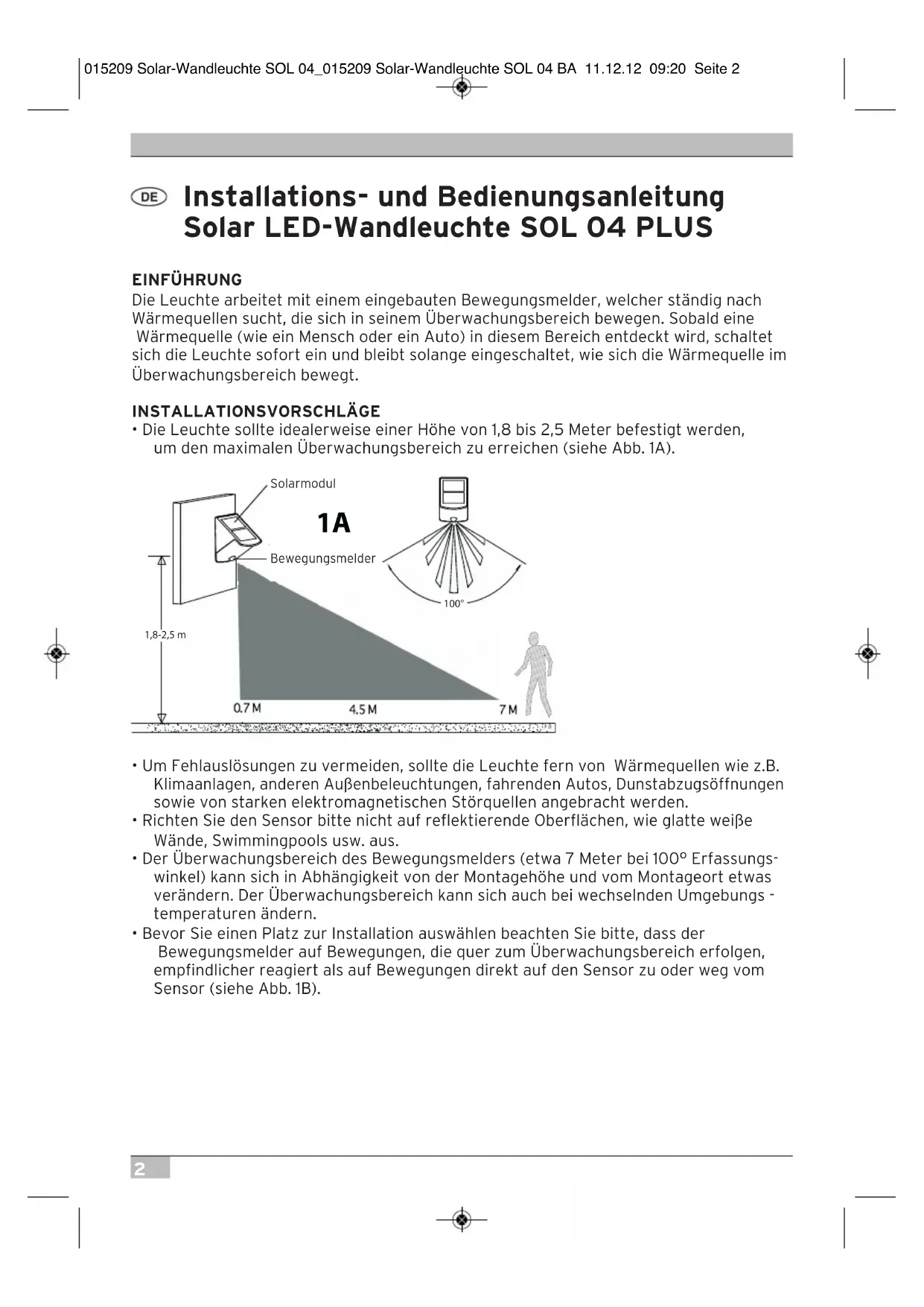 Käyttöohje ...................................................... 50 015209 Solar-Wandleuchte SOL 04_015209 Solar-Wandleuchte SOL 04 BA 11.12.12 09:20 Seite 12 Installations- und Bedienungsanleitung Solar LED-Wandleuchte SOL 04 PLUS EINFÜHRUNG Die Leuchte arbeitet mit einem eingebauten Bewegungsmelder, welcher ständig nach Wärmequellen sucht, die sich in seinem Überwachungsbereich bewegen. Sobald eine Wärmequelle (wie ein Mensch oder ein Auto) in diesem Bereich entdeckt wird, schaltet sich die Leuchte sofort ein und bleibt solange eingeschaltet, wie sich die Wärmequelle im Überwachungsbereich bewegt. INSTALLATIONSVORSCHLÄGE