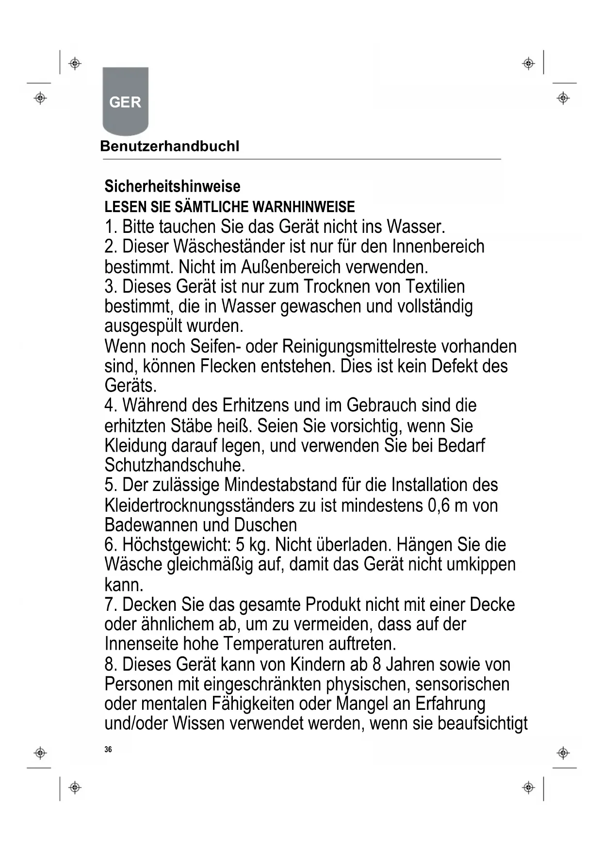 beschädigten Kabel oder Stecker oder nachdem der Wäscheständer heruntergefallen oder in irgendeiner Weise beschädigt wurde. Bringen Sie den Wäscheständer zum Hersteller oder Händler oder einer ähnlich qualifizierten Person, wenn er geprüft, elektrisch oder mechanisch eingestellt oder reparariert werden muss.