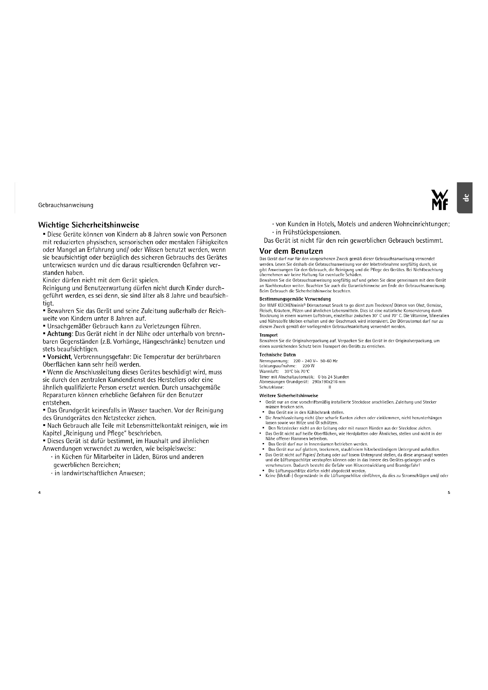 - Dieses Gerät ist dafür bestimmt, im Haushalt und ähnlichen Anwendungen verwendet zu werden, wie beispielsweise: ⋅ in Küchen für Mitarbeiter in Läden, Büros und anderen gewerblichen Bereichen; ⋅ in landwirtschaftlichen Anwesen; ⋅ von Kunden in Hotels, Motels und anderen Wohneinrichtungen; ⋅ in Frühstückspensionen. Das Gerät ist nicht für den rein gewerblichen Gebrauch bestimmt. Vor dem Benutzen Das Gerät darf nur für den vorgesehenen Zweck gemäß dieser Gebrauchsanweisung verwendet werden. Lesen Sie deshalb die Gebrauchsanweisung vor der Inbetriebnahme sorgfältig durch, sie gibt Anweisungen für den Gebrauch, die Reinigung und die Pflege des Gerätes. Bei Nichtbeachtung übernehmen wir keine Haftung für eventuelle Schäden. Bewahren Sie die Gebrauchsanweisung sorgfältig auf und geben Sie diese gemeinsam mit dem Gerät an Nachbenutzer weiter. Beachten Sie auch die Garantiehinweise am Ende der Gebrauchsanweisung. Beim Gebrauch die Sicherheitshinweise beachten. Bestimmungsgemäße Verwendung Der WMF KÜCHENminis® Dörrautomat Snack to go dient zum Trocknen/ Dörren von Obst, Gemüse, Fleisch, Kräutern, Pilzen und ähnlichen Lebensmitteln. Dies ist eine natürliche Konservierung durch Trocknung in einem warmen Luftstrom, einstellbar zwischen 30° C und 70° C. Die Vitamine, Mineralien und Nährstoffe bleiben erhalten und der Geschmack wird intensiviert. Der Dörrautomat darf nur zu diesem Zweck gemäß der vorliegenden Gebrauchsanleitung verwendet werden. Transport Bewahren Sie die Originalverpackung auf. Verpacken Sie das Gerät in der Originalverpackung, um einen ausreichenden Schutz beim Transport des Geräts zu erreichen. Technische Daten Nennspannung: 220 - 240 V~ 50-60 Hz Leistungsaufnahme: 220 W Warmluft: 30°C bis 70°C Timer mit Abschaltautomatik: 0 bis 24 Stunden Abmessungen Grundgerät: 290x190x216 mm Schutzklasse: II Weitere Sicherheitshinweise