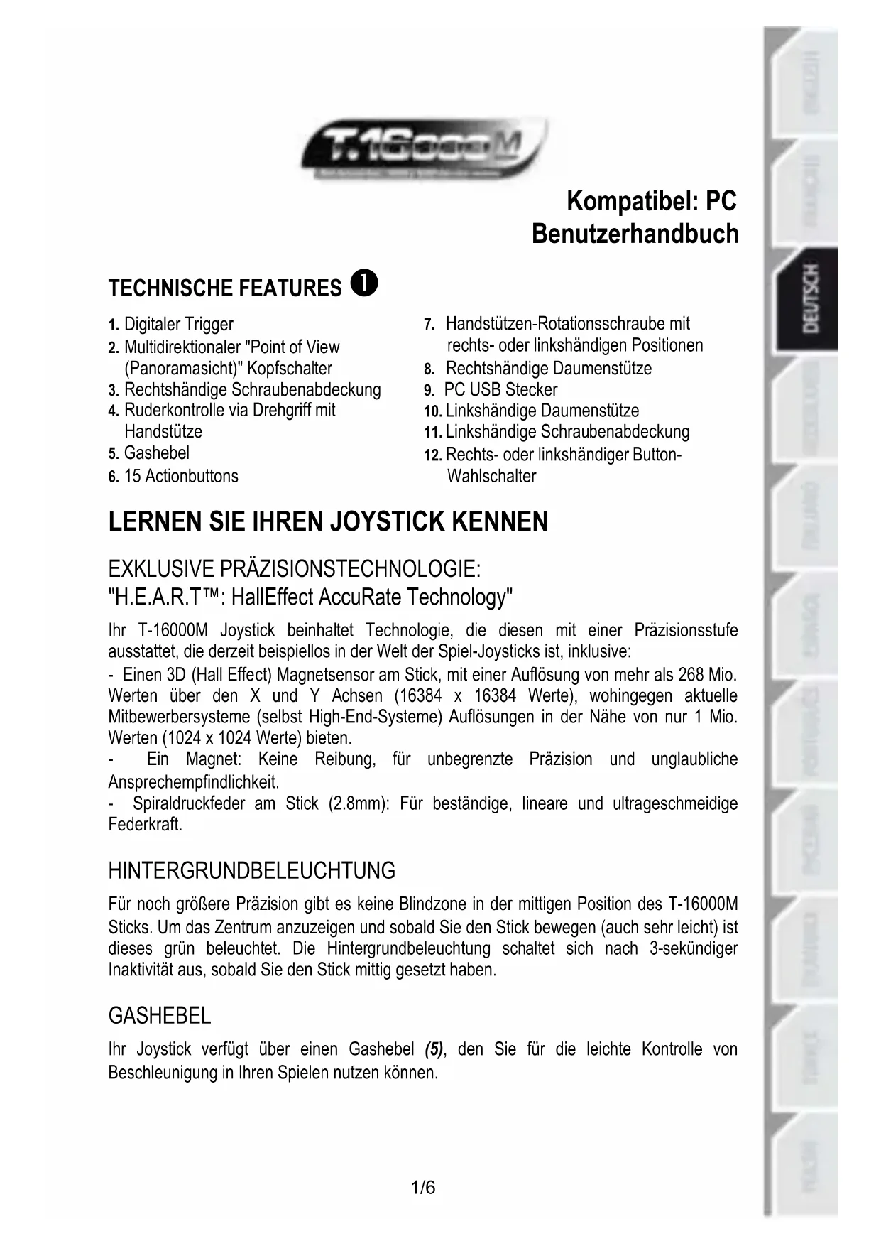 EXKLUSIVE PRÄZISIONSTECHNOLOGIE: "H.E.A.R.T™: HallEffect AccuRate Technology" Ihr T-16000M Joystick beinhaltet Technologie, die diesen mit einer Präzisionsstufe ausstattet, die derzeit beispiellos in der Welt der Spiel-Joysticks ist, inklusive: - Einen 3D (Hall Effect) Magnetsensor am Stick, mit einer Auflösung von mehr als 268 Mio. Werten über den X und Y Achsen (16384 x 16384 Werte), wohingegen aktuelle Mitbewerbersysteme (selbst High-End-Systeme) Auflösungen in der Nähe von nur 1 Mio. Werten (1024 x 1024 Werte) bieten. - Ein Magnet: Keine Reibung, für unbegrenzte Präzision und unglaubliche Ansprechempfindlichkeit. - Spiraldruckfeder am Stick (2.8mm): Für beständige, lineare und ultrageschmeidige Federkraft. HINTERGRUNDBELEUCHTUNG Für noch größere Präzision gibt es keine Blindzone in der mittigen Position des T-16000M Sticks. Um das Zentrum anzuzeigen und sobald Sie den Stick bewegen (auch sehr leicht) ist dieses grün beleuchtet. Die Hintergrundbeleuchtung schaltet sich nach 3-sekündiger Inaktivität aus, sobald Sie den Stick mittig gesetzt haben. GASHEBEL Ihr Joystick verfügt über einen Gashebel (5), den Sie für die leichte Kontrolle von Beschleunigung in Ihren Spielen nutzen können.