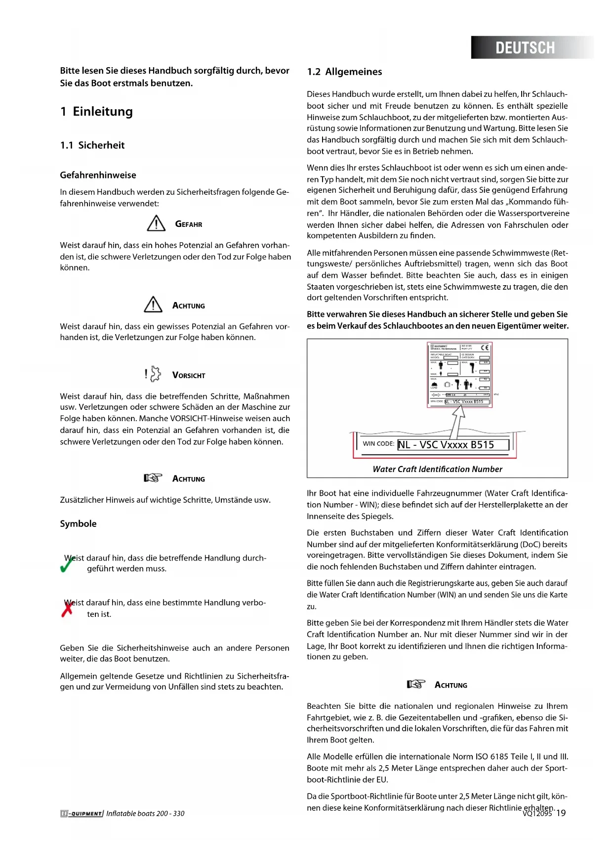 Gefahrenhinweise In diesem Handbuch werden zu Sicherheitsfragen folgende Ge- fahrenhinweise verwendet: Gefahr Weist darauf hin, dass ein hohes Potenzial an Gefahren vorhan- den ist, die schwere Verletzungen oder den Tod zur Folge haben können. achtunG Weist darauf hin, dass ein gewisses Potenzial an Gefahren vor- handen ist, die Verletzungen zur Folge haben können. vorsicht Weist darauf hin, dass die betreenden Schritte, Maßnahmen usw. Verletzungen oder schwere Schäden an der Maschine zur Folge haben können. Manche VORSICHT-Hinweise weisen auch darauf hin, dass ein Potenzial an Gefahren vorhanden ist, die schwere Verletzungen oder den Tod zur Folge haben können. achtunG Zusätzlicher Hinweis auf wichtige Schritte, Umstände usw. Symbole Weist darauf hin, dass die betreende Handlung durch- geführt werden muss. Weist darauf hin, dass eine bestimmte Handlung verbo- ten ist. Geben Sie die Sicherheitshinweise auch an andere Personen weiter, die das Boot benutzen. Allgemein geltende Gesetze und Richtlinien zu Sicherheitsfra- gen und zur Vermeidung von Unfällen sind stets zu beachten. Ihr Boot hat eine individuelle Fahrzeugnummer (Water Craft Identica- tion Number - WIN); diese bendet sich auf der Herstellerplakette an der Innenseite des Spiegels. Die ersten Buchstaben und Ziern dieser Water Craft Identication Number sind auf der mitgelieferten Konformitätserklärung (DoC) bereits voreingetragen. Bitte vervollständigen Sie dieses Dokument, indem Sie die noch fehlenden Buchstaben und Ziern dahinter eintragen. Bitte füllen Sie dann auch die Registrierungskarte aus, geben Sie auch darauf die Water Craft Identication Number (WIN) an und senden Sie uns die Karte zu. Bitte geben Sie bei der Korrespondenz mit Ihrem Händler stets die Water Craft Identication Number an. Nur mit dieser Nummer sind wir in der Lage, Ihr Boot korrekt zu identizieren und Ihnen die richtigen Informa- tionen zu geben. achtunG Beachten Sie bitte die nationalen und regionalen Hinweise zu Ihrem Fahrtgebiet, wie z. B. die Gezeitentabellen und -graken, ebenso die Si- cherheitsvorschriften und die lokalen Vorschriften, die für das Fahren mit Ihrem Boot gelten. Alle Modelle erfüllen die internationale Norm ISO 6185 Teile I, II und III. Boote mit mehr als 2,5 Meter Länge entsprechen daher auch der Sport- boot-Richtlinie der EU. Da die Sportboot-Richtlinie für Boote unter 2,5 Meter Länge nicht gilt, kön- nen diese keine Konformitätserklärung nach dieser Richtlinie erhalten.