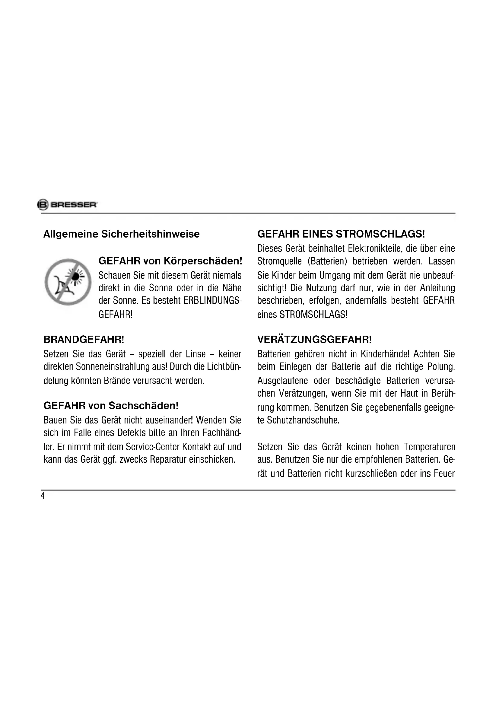 geltlich zurückgeben. Batterien und Akkus sind mit einer durchgekreuz- ten Mülltonne sowie dem chemischen Symbol des Schadstoffes bezeichnet, „Cd“ steht für Cadmium, „Hg“ steht für Quecksilber und „Pb“ steht für Blei. AD? 1 Batterie enthält Cadmium 2 Batterie enthält Quecksilber 3 Batterie enthält Blei GARANTIE & SERVICE Die reguläre Garantiezeit beträgt 2 Jahre und beginnt am Tag des Kaufs. Um von einer ver- längerten, freiwilligen Garantiezeit wie auf dem Geschenkkarton angegeben zu profi tieren, ist eine Registrierung auf unserer Website erfor- derlich. Die vollständigen Garantiebedingungen sowie Informationen zu Garantiezeitverlänge- rung und Serviceleistungen können Sie unter www.bresser.de/garantiebedingungen einsehen.10 General Warnings RISK of bodily injury! Never use this device to look directly at the sun or in the direct proximity of the sun. Doing so may result in a risk of blindness. FIRE RISK! Do not place the device, particularly the lenses, in direct sunlight. The concentration of light could cause a fi re. RISK of property damage! Do not disassemble the device. In the event of a defect, please contact your dealer. The dealer will contact the Service Centre and can send the device in to be repaired, if necessary.