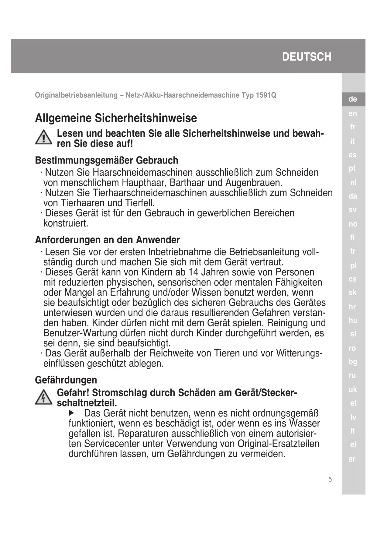 - Das Gerät außerhalb der Reichweite von Tieren und vor Witterungs- einflüssen geschützt ablegen. Gefährdungen Gefahr! Stromschlag durch Schäden am Gerät/Stecker- schaltnetzteil. f Das Gerät nicht benutzen, wenn es nicht ordnungsgemäß funktioniert, wenn es beschädigt ist, oder wenn es ins Wasser gefallen ist. Reparaturen ausschließlich von einem autorisier- ten Servicecenter unter Verwendung von Original-Ersatzteilen durchführen lassen, um Gefährdungen zu vermeiden. Originalbetriebsanleitung – Netz-/Akku-Haarschneidemaschine Typ 1591QDEUTSCH
