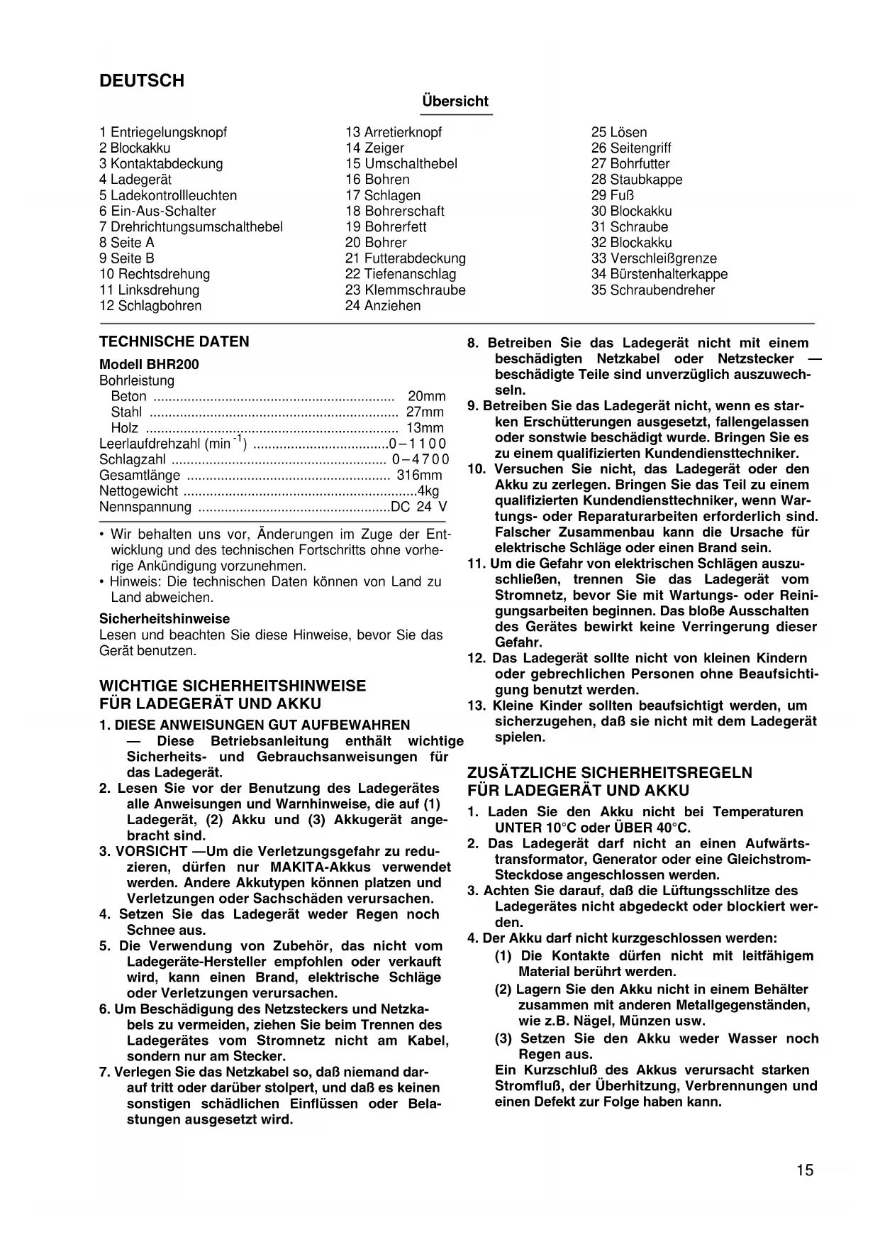 - Bei montiertem Bohrfutteradapter mit dem Bohrfutter darf keinesfalls die Betriebsart “Hammerbohren” gewählt werden. Ausbläser (Abb. 19) Verwenden Sie den Ausbläser, um das Bohrloch von Spänen und Partikeln zu säubern. Staubschutzkappe (Abb. 20) Bei Überkopfarbeiten die Staubschutzkappe verwenden, um zu verhindern, daß Staub auf den Bedienenden und die Werkzeugaufnahme fällt. Die Staubschutzkappe auf dem Bohrer befestigen. Die Staubschutzkappe kann für folgende Bohrergrößen verwendet werden. Fuß Entfernen Sie den Fuß bei Verwendung des Akkus B2417. Dies trägt zur stabilen Platzierung des Werkzeugs bei. (Abb.21) Installieren Sie den Fuß bei Verwendung des Akkus B2430. Dies trägt zur stabilen Platzierung des Werkzeugs bei. (Abb.22) Bohrerdurchmesser (mm) Staubschutzkappe 5 6– 14,5 Staubschutzkappe 9 12– 1620 WARTUNG VORSICHT: Vor Arbeiten am Gerät vergewissern Sie sich, daß sich der Schalter in der “OFF”- Position befindet und der Akku aus dem Gerät entfernt ist. Kohlebürsten wechseln (Abb.23 u. 24) Die Kohlebürsten müssen regelmäßig entfernt und über- prüft werden. Wenn sie bis zur Verschleißgrenze abge- nutzt sind, müssen sie erneuert werden. Die Kohlebürsten stets sauber halten, damit sie ungehindert in den Haltern gleiten können. Beide Kohlebürsten soll- ten gleichzeitig erneuert werden. Verwenden Sie nur identische Kohlebürsten. Die Bürstenhalterkappen mit einem Schraubendreher herausdrehen. Die abgenutzten Kohlebürsten heraus- nehmen, die neuen einsetzen, und dann die Bürstenhal- terkappen wieder eindrehen. Um die Sicherheit und Zuverlässigkeit dieses Gerätes zu gewährleisten, sollten Reparatur-, Wartungs-, und Ein- stellarbeiten nur von Makita autorisierten Werkstätten oder Kundendienstzentren unter ausschließlicher Ver- wendung von Makita-Originalersatzteilen ausgeführt werden.21 ITALIANO Visione generale 1 Bottone 2 Cartuccia batteria 3 Coperchio terminale 4 Caricatore batteria 5 Spie di carica 6 Interruttore 7 Leva interruttore di inversione 8Lato A 9Lato B 10 Senso orario 11 Senso antiorario 12 Rotazione con martellamento 13 Bottone di blocco 14 Indice 15 Leva di cambio 16 Rotazione soltanto 17 Martellamento soltanto 18 Codolo punta 19 Grasso punta 20 Punta 21 Coperchio mandrino 22 Calibro di profondità 23 Vite di fermo 24 Per stringere 25 Per allentare 26 Impugnatura laterale 27 Mandrino trapano 28 Parapolvere 29 Piedino 30 Batteria 31 Vite 32 Batteria 33 Segno limite 34 Tappo portaspazzole 35 Cacciavite DATI TECNICI Modello BHR200 Capacità Cemento ........................................................... 20mm Acciaio ............................................................... 27mm Legno ................................................................. 13 mm Velocità a vuoto (min
