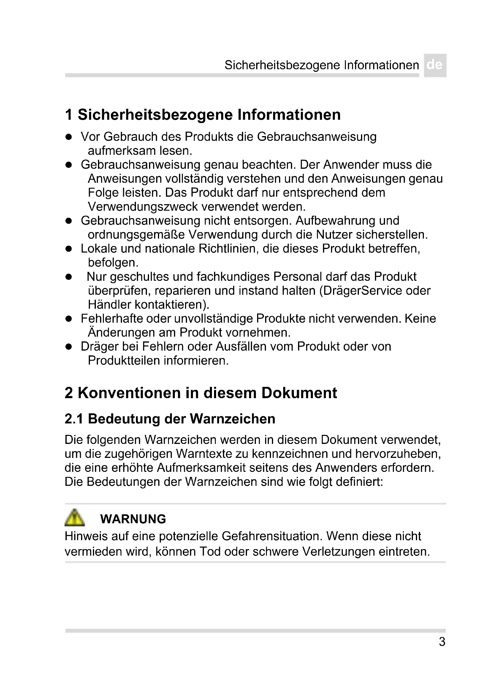 1 Sicherheitsbezogene Informationen Vor Gebrauch des Produkts die Gebrauchsanweisung aufmerksam lesen. Gebrauchsanweisung genau beachten. Der Anwender muss die Anweisungen vollständig verstehen und den Anweisungen genau Folge leisten. Das Produkt darf nur entsprechend dem Verwendungszweck verwendet werden. Gebrauchsanweisung nicht entsorgen. Aufbewahrung und ordnungsgemäße Verwendung durch die Nutzer sicherstellen. Lokale und nationale Richtlinien, die dieses Produkt betreffen, befolgen. Nur geschultes und fachkundiges Personal darf das Produkt überprüfen, reparieren und instand halten (DrägerService oder Händler kontaktieren). Fehlerhafte oder unvollständige Produkte nicht verwenden. Keine Änderungen am Produkt vornehmen. Dräger bei Fehlern oder Ausfällen vom Produkt oder von Produktteilen informieren. 2 Konventionen in diesem Dokument