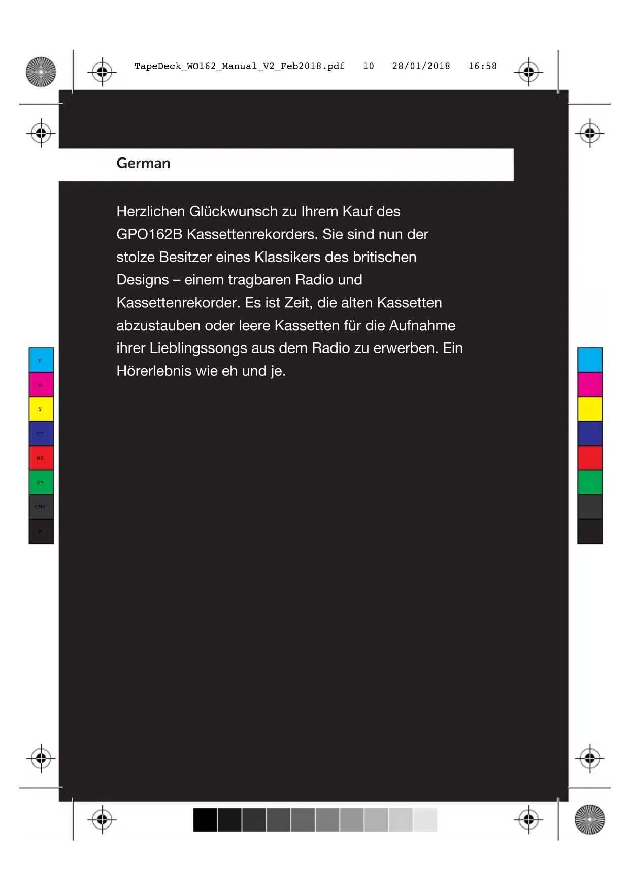 TapeDeck_WO162_Manual_V2_Feb2018.pdf 9 28/01/2018 16:58German Herzlichen Glückwunsch zu Ihrem Kauf des GPO162B Kassettenrekorders. Sie sind nun der stolze Besitzer eines Klassikers des britischen Designs – einem tragbaren Radio und Kassettenrekorder. Es ist Zeit, die alten Kassetten abzustauben oder leere Kassetten für die Aufnahme ihrer Lieblingssongs aus dem Radio zu erwerben. Ein Hörerlebnis wie eh und je.