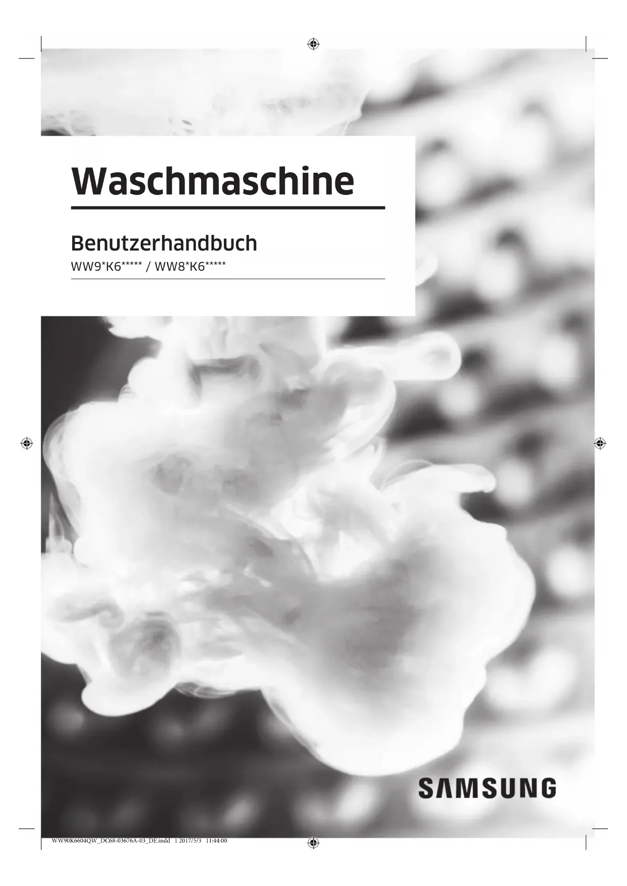 www.samsung.com/be/support (Dutch) www.samsung.com/be_fr/support (French) DC68-03676A-03 WW90K6604QW_DC68-03676A-03_FR.indd 64 2017/5/3 11:47:06Waschmaschine Benutzerhandbuch WW9*K6***** / WW8*K6***** WW90K6604QW_DC68-03676A-03_DE.indd 1 2017/5/3 11:44:002 Deutsch Inhalt Inhalt Sicherheitsinformationen 3 Wichtige Informationen zu den Sicherheitshinweisen 3 Wichtige Sicherheitssymbole 3 Wichtige Sicherheitsvorkehrungen 4 Hinweise zum WEEE-Zeichen 12 Installation 13 Das ist inbegriffen 13 Installationsanforderungen 15 Schrittweise Installation 17 Vor dem Start 23 Grundeinstellungen 23 Waschhinweise 23 Richtlinien Waschmittelbehälter 26 Betrieb 29 Bedienfeld 29 Einfache Schritte für den Start 31 Programmübersicht 32 Spezialfunktionen 35 Einstellungen 37 Samsung Smart Home-App 38 Wartung 42