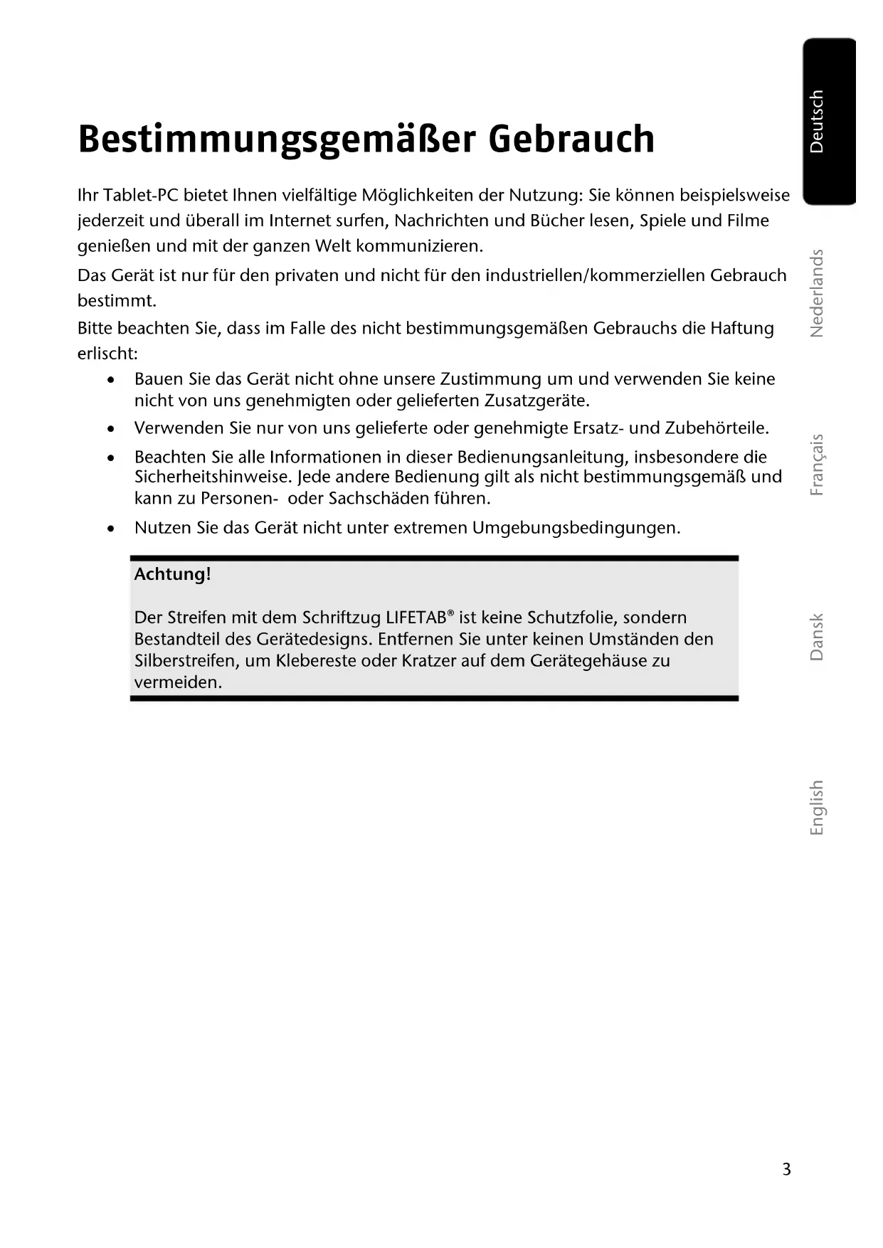 Warenzeichen: Google, Android und weitere Google-Marken sind geschützte Marken der Google Inc. Hergestellt unter Lizenz von Dolby Laboratories. Dolby und das Doppel-D-Symbol sind Warenzeichen von Dolby Laboratories. Andere Warenzeichen sind Eigentum ihrer jeweiligen Besitzer. Technische und optische Änderungen sowie Druckfehler vorbehalten.3 Français Nederlands Deutsch Dansk English Bestimmungsgemäßer Gebrauch Ihr Tablet-PC bietet Ihnen vielfältige Möglichkeiten der Nutzung: Sie können beispielsweise jederzeit und überall im Internet surfen, Nachrichten und Bücher lesen, Spiele und Filme genießen und mit der ganzen Welt kommunizieren. Das Gerät ist nur für den privaten und nicht für den industriellen/kommerziellen Gebrauch bestimmt. Bitte beachten Sie, dass im Falle des nicht bestimmungsgemäßen Gebrauchs die Haftung erlischt: Bauen Sie das Gerät nicht ohne unsere Zustimmung um und verwenden Sie keine nicht von uns genehmigten oder gelieferten Zusatzgeräte. Verwenden Sie nur von uns gelieferte oder genehmigte Ersatz- und Zubehörteile. Beachten Sie alle Informationen in dieser Bedienungsanleitung, insbesondere die Sicherheitshinweise. Jede andere Bedienung gilt als nicht bestimmungsgemäß und kann zu Personen- oder Sachschäden führen. Nutzen Sie das Gerät nicht unter extremen Umgebungsbedingungen. Achtung! Der Streifen mit dem Schriftzug LIFETAB® ist keine Schutzfolie, sondern Bestandteil des Gerätedesigns. Entfernen Sie unter keinen Umständen den Silberstreifen, um Klebereste oder Kratzer auf dem Gerätegehäuse zu vermeiden.4 Konformitätsinformation Mit diesem Tablet-PC wurden folgende Funkausstattungen ausgeliefert: Wireless LAN Bluetooth