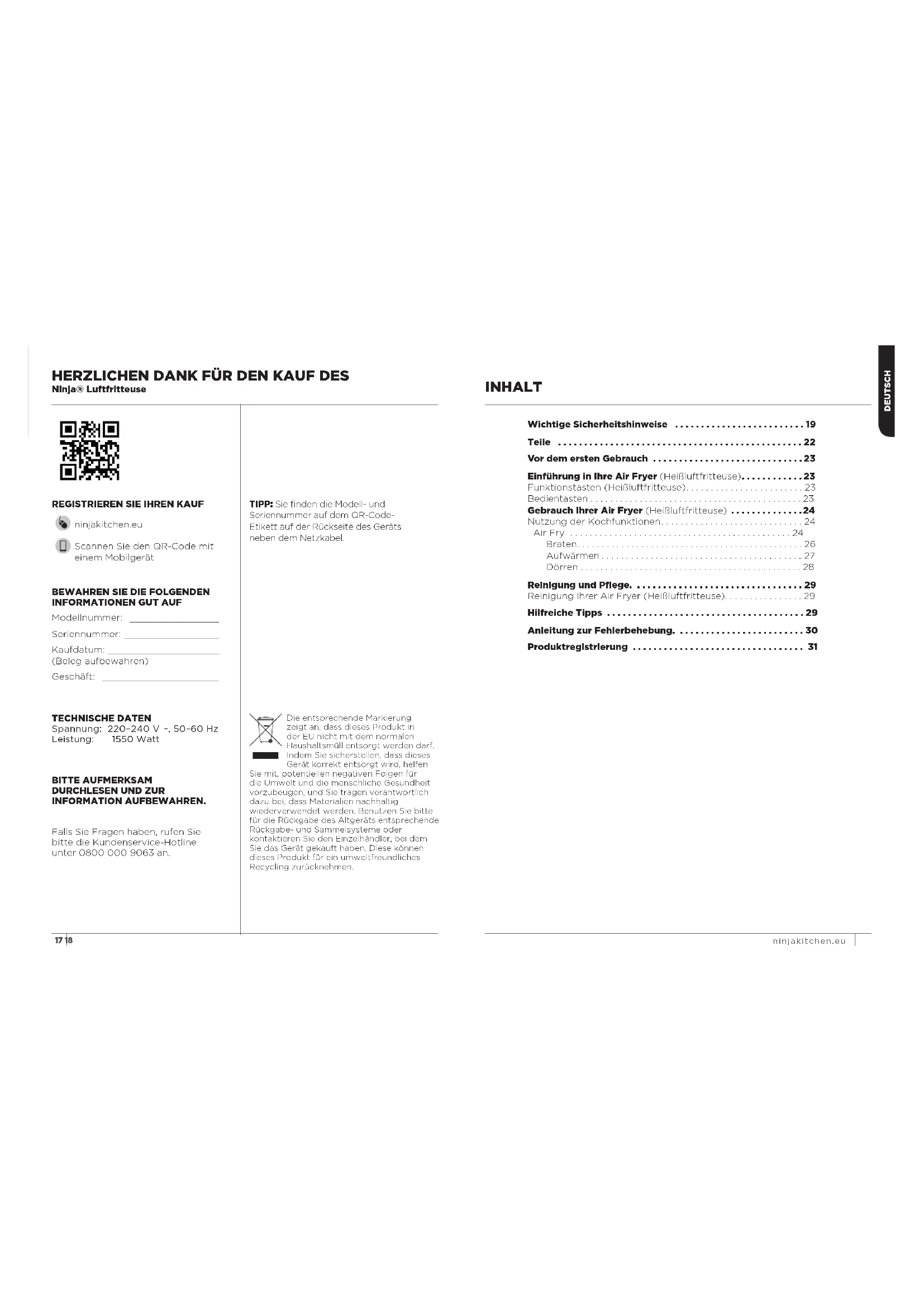 ninjakitchen.eu Scannen Sie den QR-Code mit einem Mobilgerät Die entsprechende Markierung zeigt an, dass dieses Produkt in der EU nicht mit dem normalen Haushaltsmüll entsorgt werden darf. Indem Sie sicherstellen, dass dieses Gerät korrekt entsorgt wird, helfen Sie mit, potentiellen negativen Folgen für die Umwelt und die menschliche Gesundheit vorzubeugen, und Sie tragen verantwortlich dazu bei, dass Materialien nachhaltig wiederverwendet werden. Benutzen Sie bitte für die Rückgabe des Altgeräts entsprechende Rückgabe- und Sammelsysteme oder kontaktieren Sie den Einzelhändler, bei dem Sie das Gerät gekauft haben. Diese können dieses Produkt für ein umweltfreundliches Recycling zurücknehmen.19 20 ninjakitchen.eu DEUTSCH WICHTIGE SICHERHEITSANWEISUNGEN