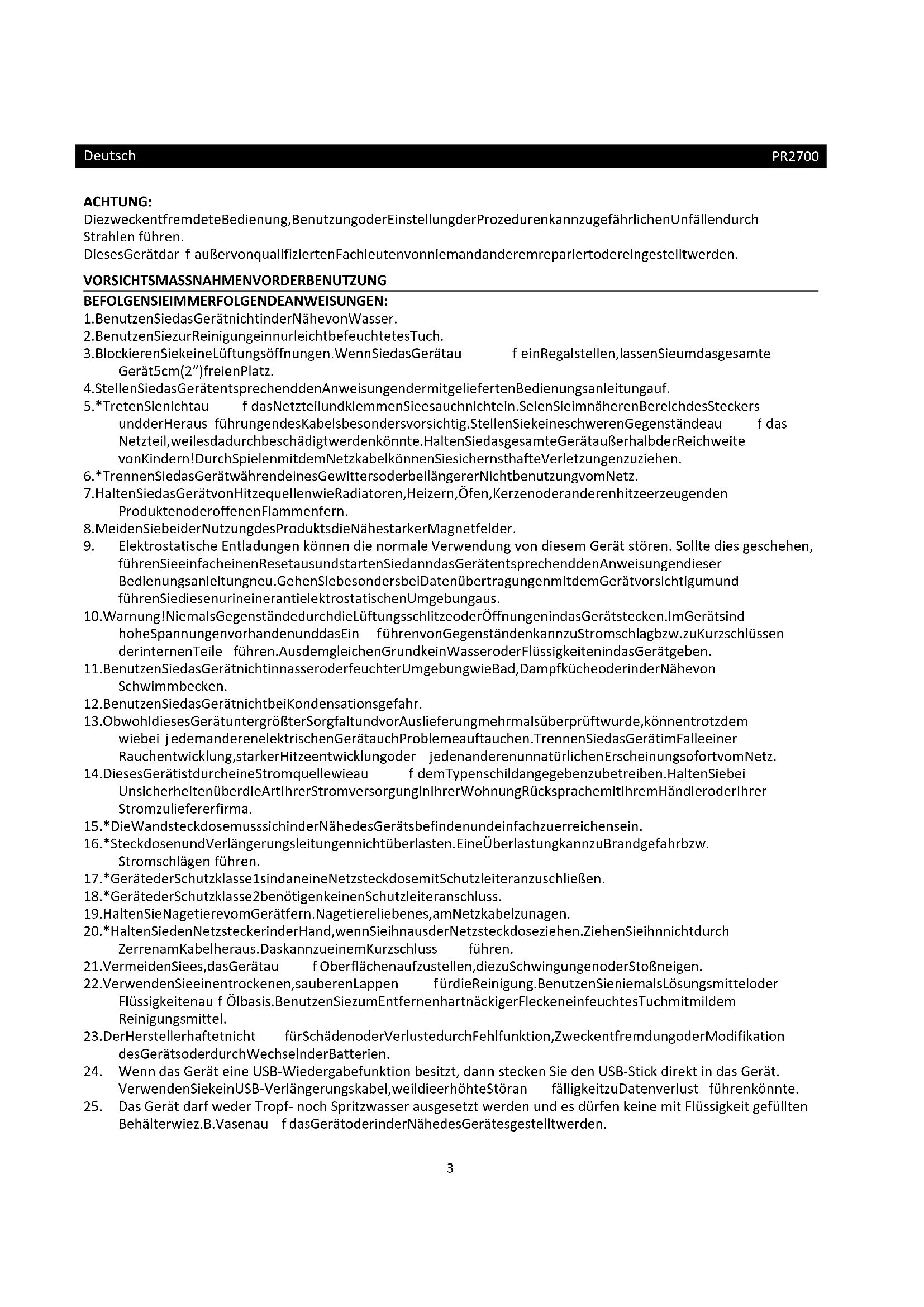 Deutsch PR2700 ACHTUNG: Die zweckentfremdete Bedienung, Benutzung oder Einstellung der Prozeduren kann zu gefährlichen Unfällen durch Strahlen