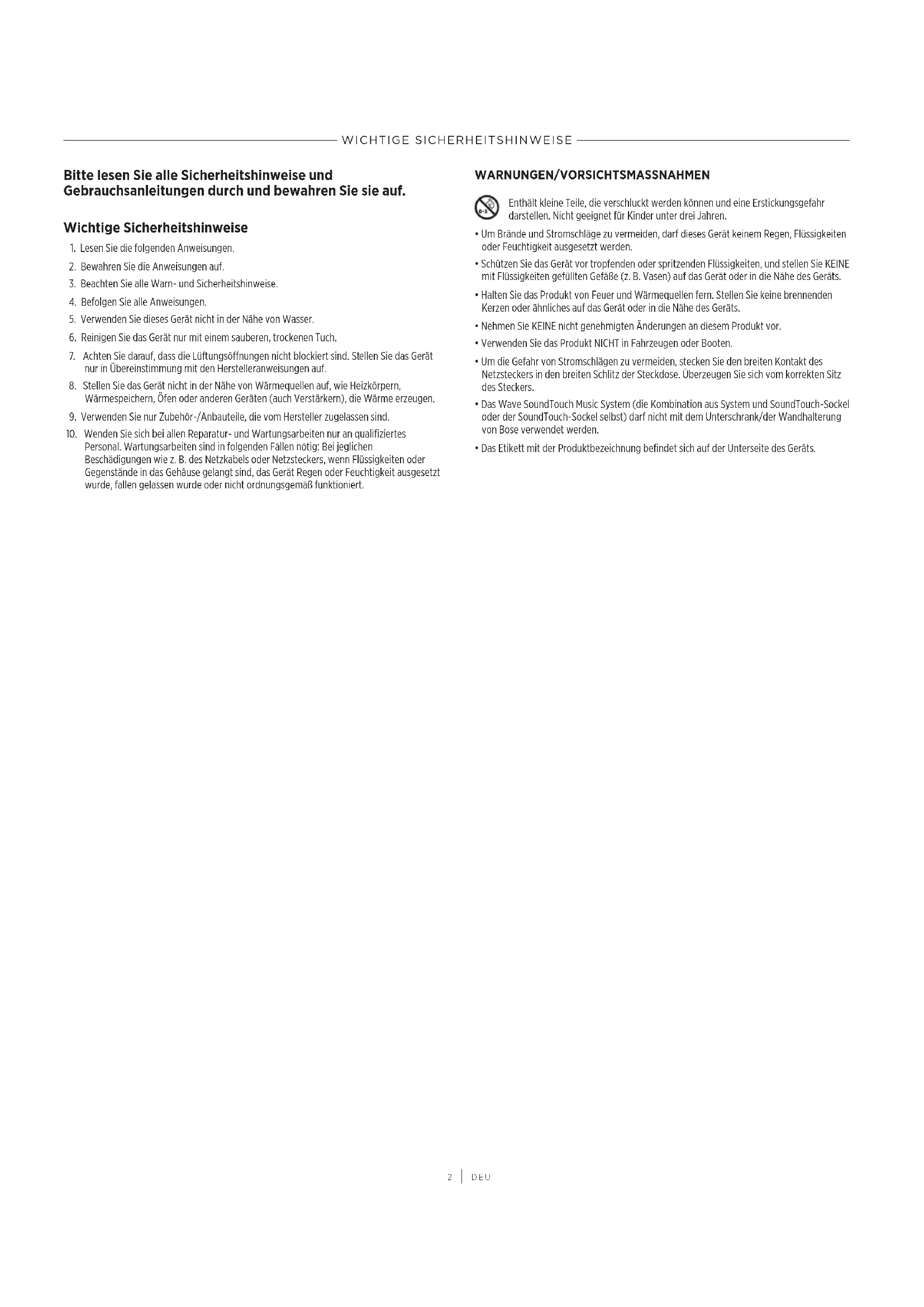 DEU WICHTIGE SICHERHEITSHINWEISE Bitte lesen Sie alle Sicherheitshinweise und Gebrauchsanleitungen durch und bewahren Sie sie auf. Wichtige Sicherheitshinweise