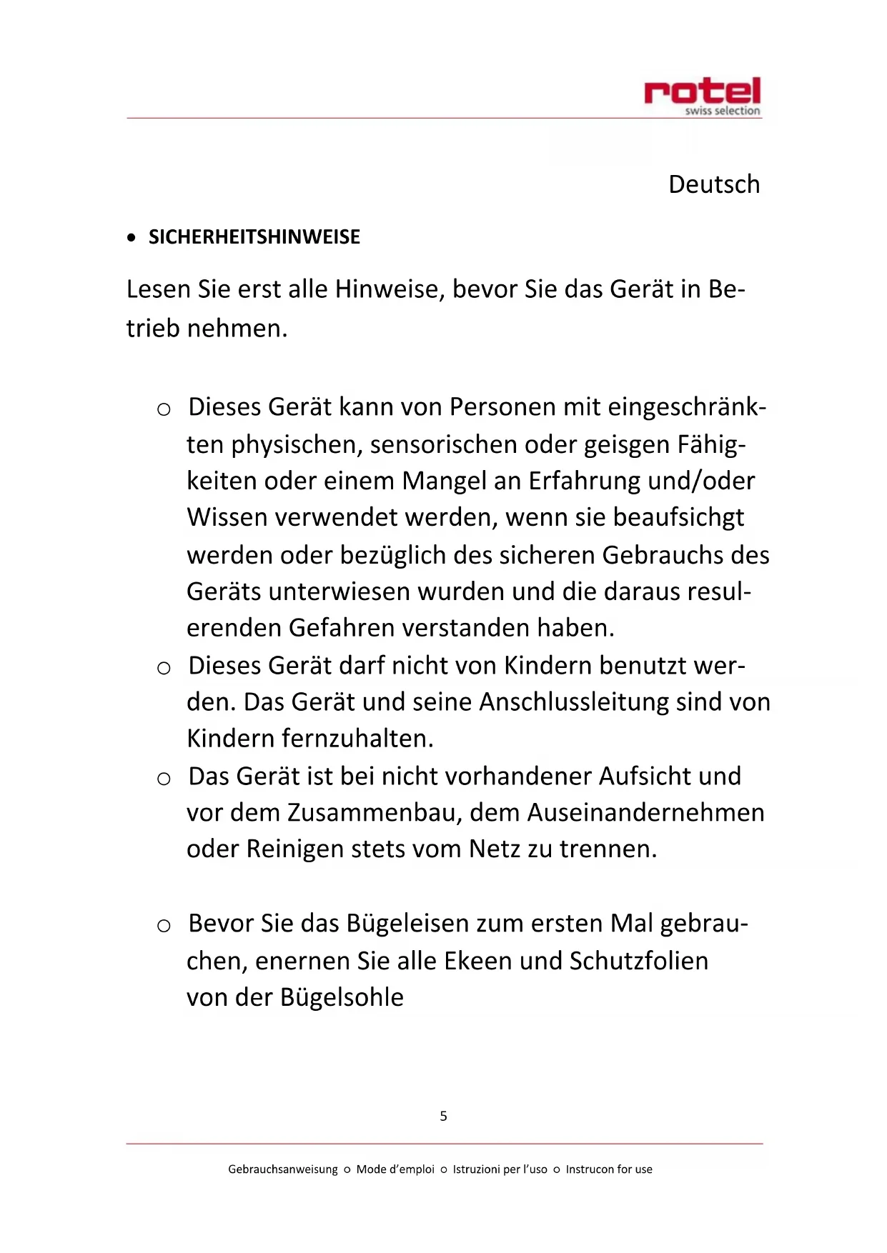 Deutsch SICHERHEITSHINWEISE Lesen Sie erst alle Hinweise, bevor Sie das Gerät in Be- trieb nehmen. o Dieses Gerät kann von Personen mit eingeschränk- ten physischen, sensorischen oder geistigen Fähig- keiten oder einem Mangel an Erfahrung und/oder Wissen verwendet werden, wenn sie beaufsichtigt werden oder bezüglich des sicheren Gebrauchs des Geräts unterwiesen wurden und die daraus resul- tierenden Gefahren verstanden haben. o Dieses Gerät darf nicht von Kindern benutzt wer- den. Das Gerät und seine Anschlussleitung sind von Kindern fernzuhalten. o Das Gerät ist bei nicht vorhandener Aufsicht und vor dem Zusammenbau, dem Auseinandernehmen oder Reinigen stets vom Netz zu trennen. o Bevor Sie das Bügeleisen zum ersten Mal gebrau- chen, entfernen Sie alle Etiketten und Schutzfolien von der BügelsohleGebrauchsanweisung ○ Mode d’emploi ○ Istruzioni per l’uso ○ Instruction for use