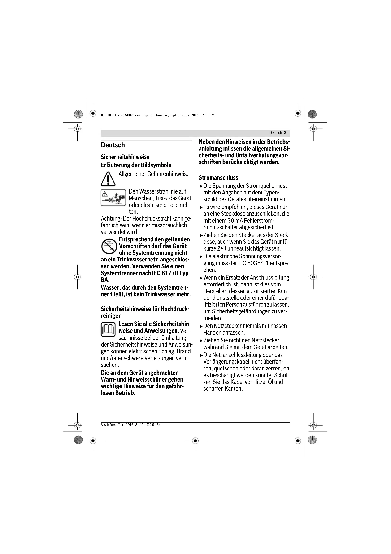 . . . . . . . . . . . . . . . . . . . . . . . . . . . . . . . . . . . . . . . . . . . . . . . . . I OBJ_BUCH-1953-009.book Page 2 Thursday, September 22, 2016 12:11 PMDeutsch | 3 Bosch Power Tools F 016 L81 441 | (22.9.16) Deutsch Sicherheitshinweise Erläuterung der Bildsymbole Allgemeiner Gefahrenhinweis. Den Wasserstrahl nie auf Menschen, Tiere, das Gerät oder elektrische Teile rich- ten. Achtung: Der Hochdruckstrahl kann ge- fährlich sein, wenn er missbräuchlich verwendet wird. Entsprechend den geltenden Vorschriften darf das Gerät ohne Systemtrennung nicht an ein Trinkwassernetz angeschlos- sen werden. Verwenden Sie einen Systemtrenner nach IEC 61770 Typ BA. Wasser, das durch den Systemtren- ner fließt, ist kein Trinkwasser mehr. Sicherheitshinweise für Hochdruck- reiniger Lesen Sie alle Sicherheitshin- weise und Anweisungen. Ver- säumnisse bei der Einhaltung der Sicherheitshinweise und Anweisun- gen können elektrischen Schlag, Brand und/oder schwere Verletzungen verur- sachen. Die an dem Gerät angebrachten Warn- und Hinweisschilder geben wichtige Hinweise für den gefahr- losen Betrieb. Neben den Hinweisen in der Betriebs- anleitung müssen die allgemeinen Si- cherheits- und Unfallverhütungsvor- schriften berücksichtigt werden. Stromanschluss