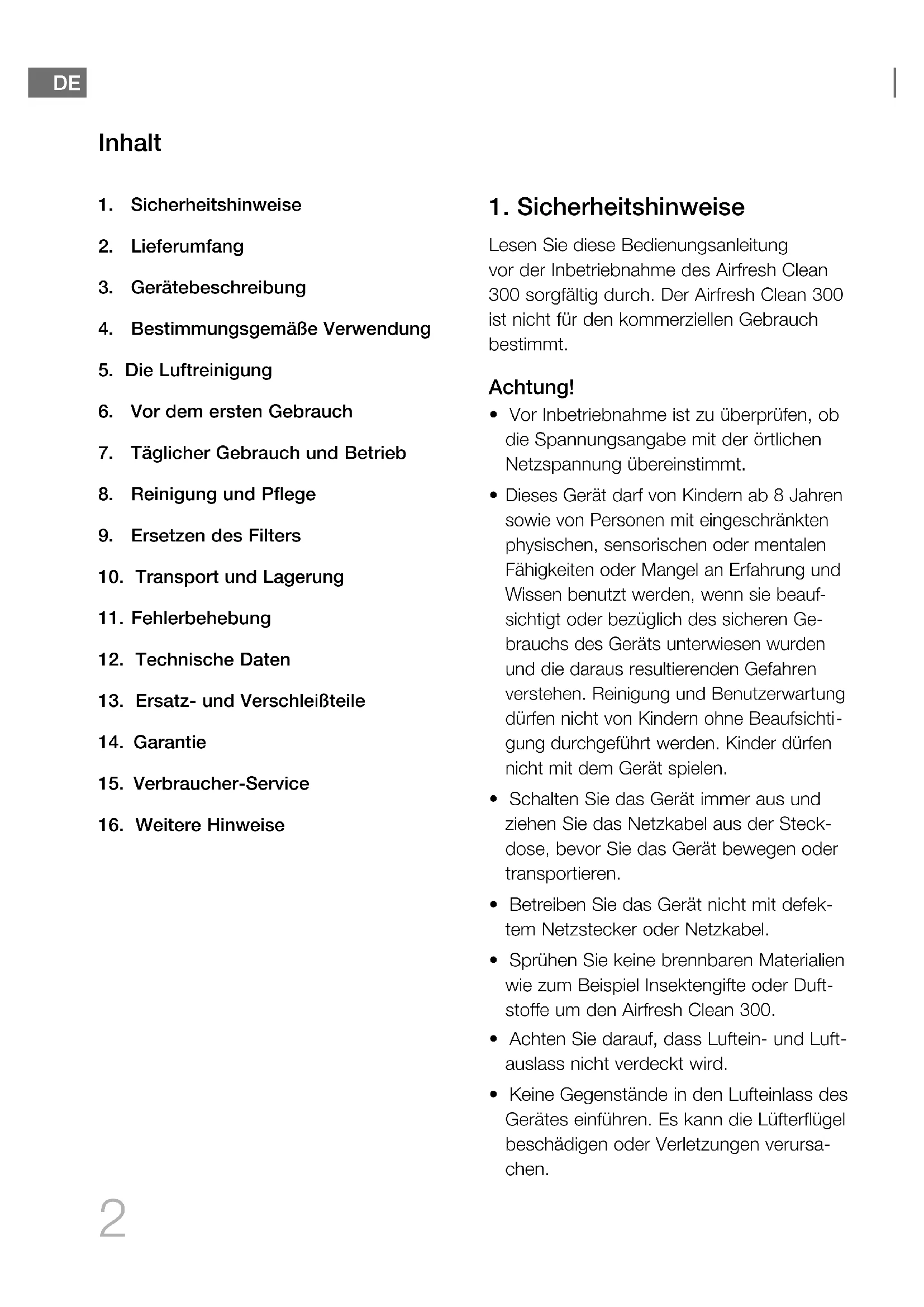 Lesen Sie diese Bedienungsanleitung vor der Inbetriebnahme des Airfresh Clean 300 sorgfältig durch. Der Airfresh Clean 300 ist nicht für den kommerziellen Gebrauch bestimmt. Achtung!