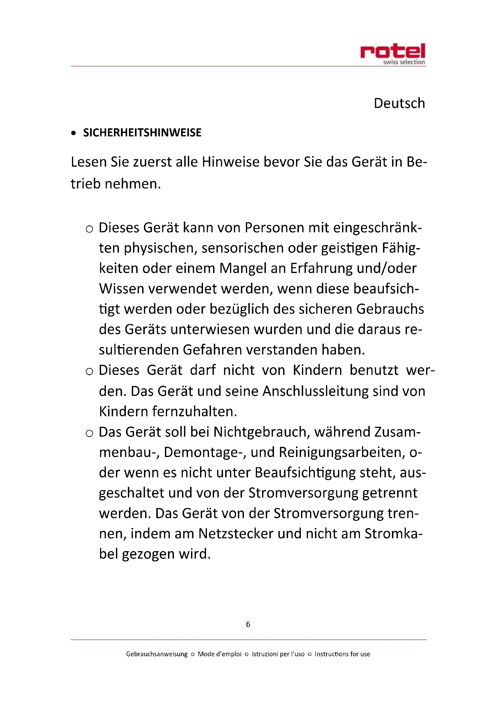 - Zur ordnungsgemässen Entsorgung geben Sie das Gerät bitte an einen Händler, den Kundendienst oder Rotel AG zurück.