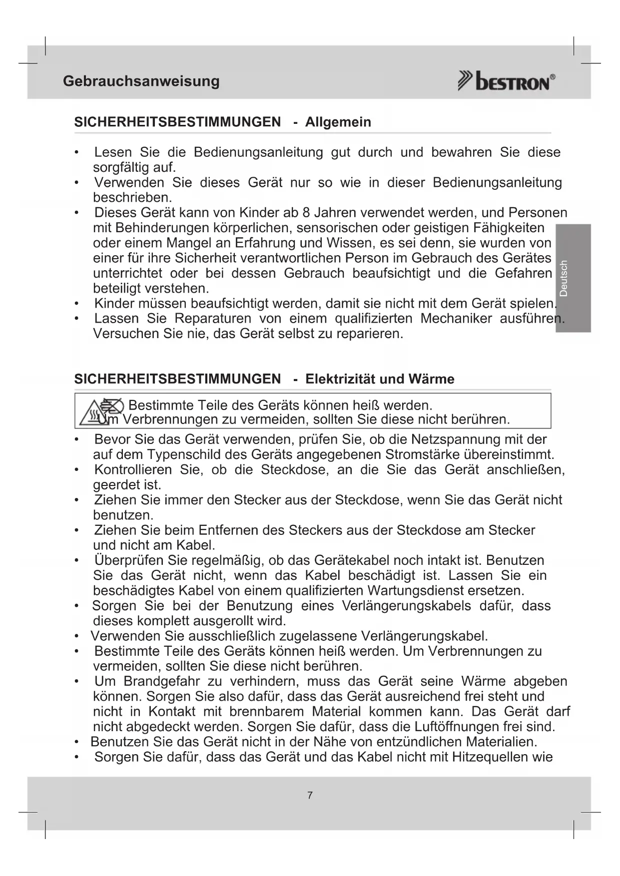 KUNDENDIENST Sollte unerwartet eine Störung auftreten dann können Sie sich mit dem BESTRON-Kundendienst in Verbindung setzen: www.bestron.com/service
