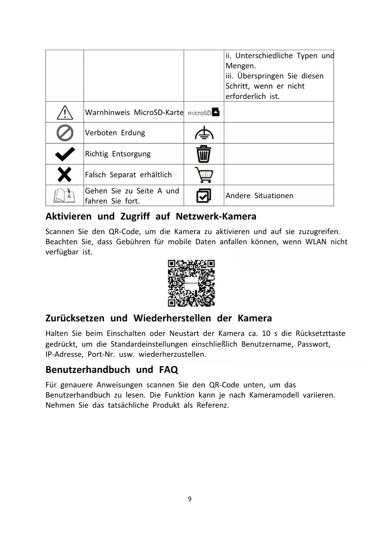 Schritt, wenn er nicht erforderlich ist. Warnhinweis MicroSD-Karte Verboten Erdung Richtig Entsorgung Falsch Separat erhältlich Gehen Sie zu Seite A und fahren Sie fort. Andere Situationen Aktivieren und Zugriff auf Netzwerk-Kamera Scannen Sie den QR-Code, um die Kamera zu aktivieren und auf sie zuzugreifen. Beachten Sie, dass Gebühren für mobile Daten anfallen können, wenn WLAN nicht verfügbar ist. Zurücksetzen und Wiederherstellen der Kamera Halten Sie beim Einschalten oder Neustart der Kamera ca. 10 s die Rücksetzttaste gedrückt, um die Standardeinstellungen einschließlich Benutzername, Passwort, IP-Adresse, Port-Nr. usw. wiederherzustellen. Benutzerhandbuch und FAQ Für genauere Anweisungen scannen Sie den QR-Code unten, um das Benutzerhandbuch zu lesen. Die Funktion kann je nach Kameramodell variieren. Nehmen Sie das tatsächliche Produkt als Referenz.10 Thermische Netzwerk-Bulletkamera Bi-Spektrum Netzwerk-Bulletkamera FAQ Informationen zur Einhaltung gesetzlicher Vorschriften und zur Sicherheit Lesen Sie alle Informationen und Anweisungen in diesem Dokument sorgfältig, bevor Sie das Gerät in Betrieb nehmen und bewahren Sie sie zum Nachschlagen auf. Weitere Informationen zum Gerät und Anleitungen finden Sie auf unserer Website unter https://www.hikvision.com. Weitere Informationen finden Sie auch in anderen Dokumenten (falls vorhanden), die dem Gerät beiliegen oder Sie können den QR-Code (falls vorhanden) auf der Verpackung scannen. Haftungsausschluss