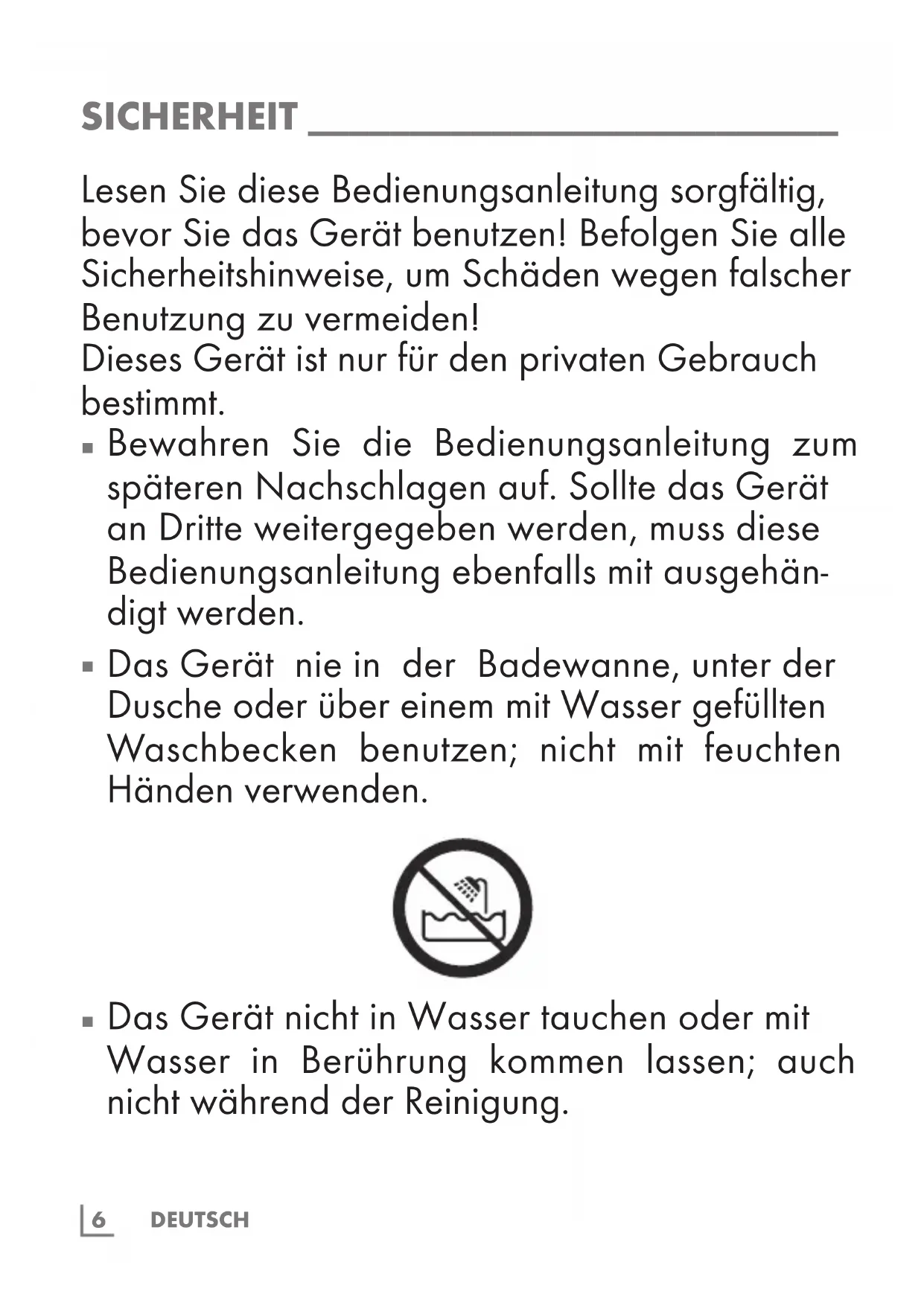 SICHERHEIT __________________________ Lesen Sie diese Bedienungsanleitung sorgfältig, bevor Sie das Gerät benutzen! Befolgen Sie alle Sicherheitshinweise, um Schäden wegen falscher Benutzung zu vermeiden! Dieses Gerät ist nur für den privaten Gebrauch bestimmt.