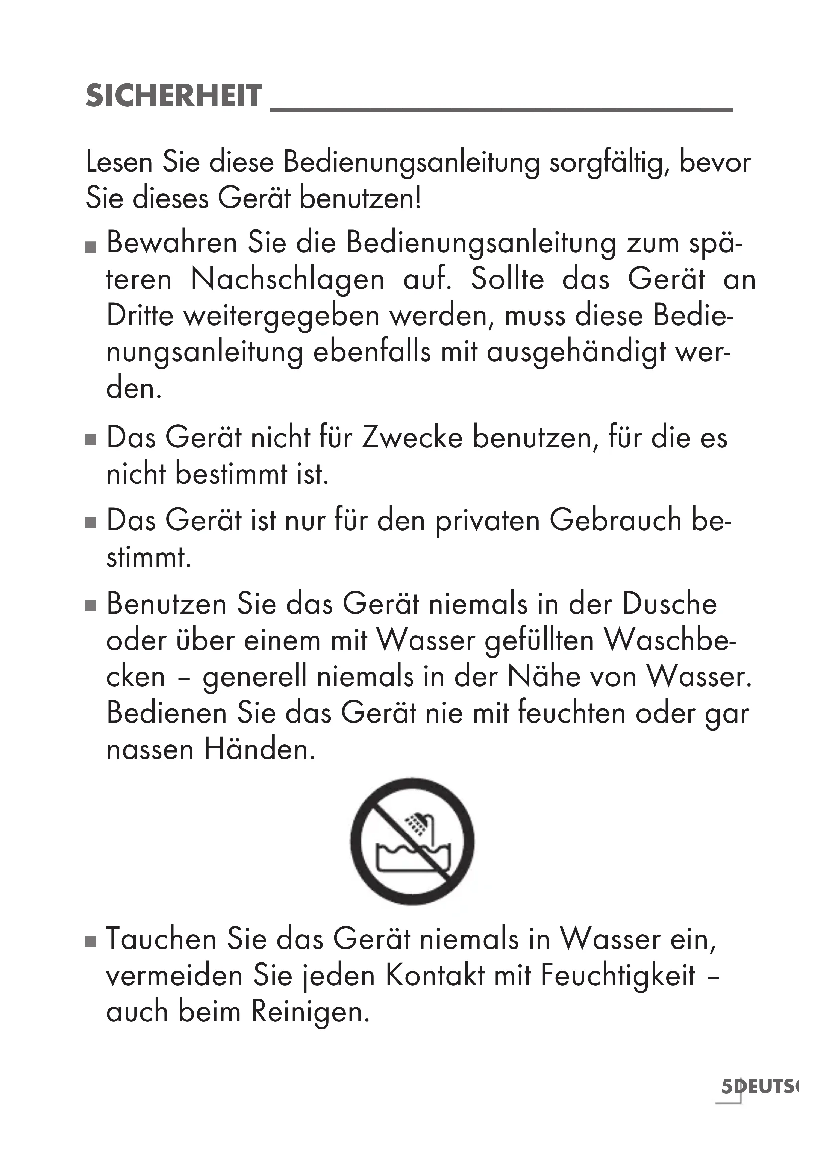 Tauchen Sie das Gerät niemals in Wasser ein, vermeiden Sie jeden Kontakt mit Feuchtigkeit – auch beim Reinigen.6 DEUTSCH SICHERHEIT ____________________________