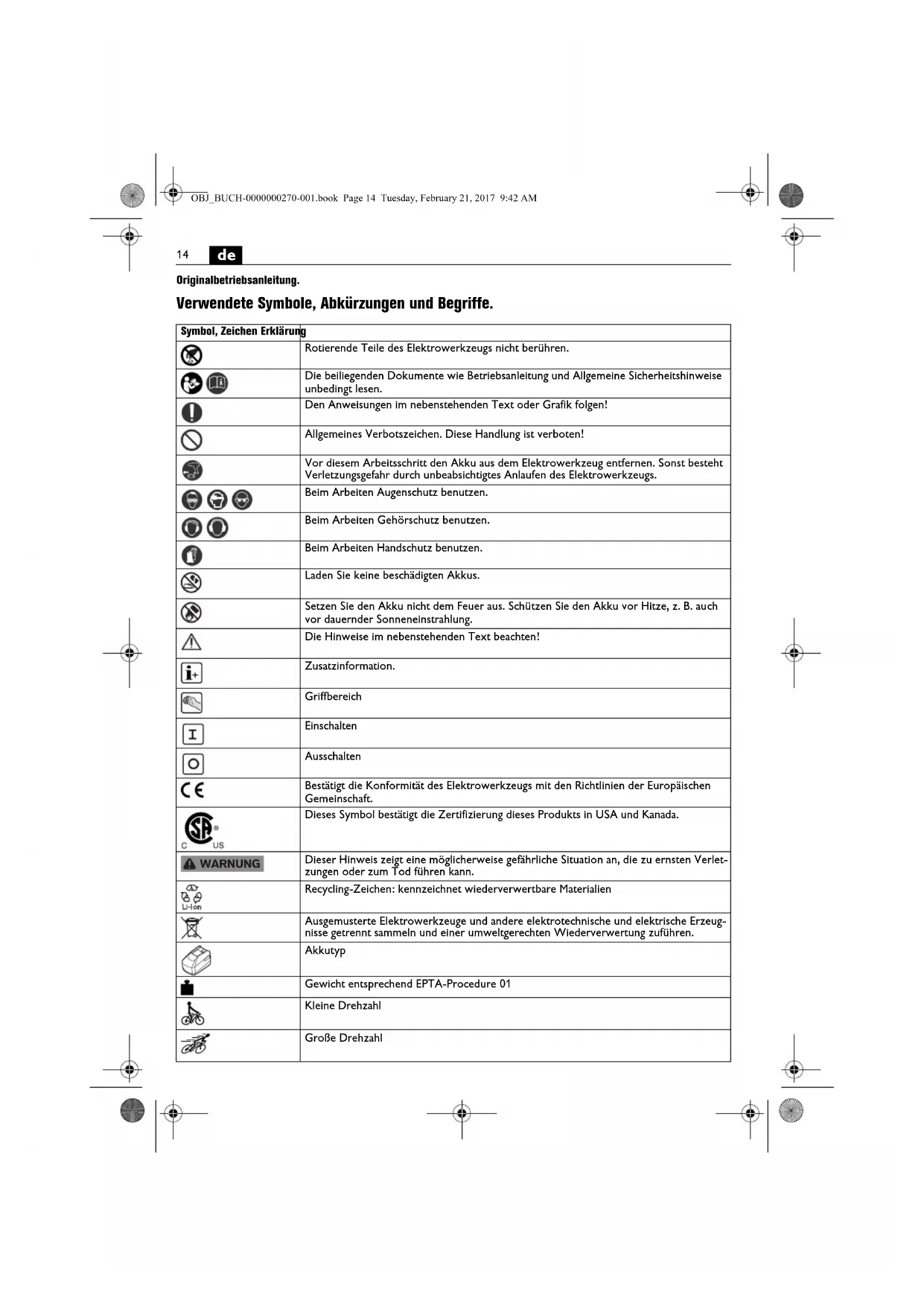 Originalbetriebsanleitung. Verwendete Symbole, Abkürzungen und Begriffe. Symbol, Zeichen Erklärung Rotierende Teile des Elektrowerkzeugs nicht berühren. Die beiliegenden Dokumente wie Betriebsanleitung und Allgemeine Sicherheitshinweise unbedingt lesen. Den Anweisungen im nebenstehenden Text oder Grafik folgen! Allgemeines Verbotszeichen. Diese Handlung ist verboten! Vor diesem Arbeitsschritt den Akku aus dem Elektrowerkzeug entfernen. Sonst besteht Verletzungsgefahr durch unbeabsichtigtes Anlaufen des Elektrowerkzeugs. Beim Arbeiten Augenschutz benutzen. Beim Arbeiten Gehörschutz benutzen. Beim Arbeiten Handschutz benutzen. Laden Sie keine beschädigten Akkus. Setzen Sie den Akku nicht dem Feuer aus. Schützen Sie den Akku vor Hitze, z. B. auch vor dauernder Sonneneinstrahlung. Die Hinweise im nebenstehenden Text beachten! Zusatzinformation. Griffbereich Einschalten Ausschalten Bestätigt die Konformität des Elektrowerkzeugs mit den Richtlinien der Europäischen Gemeinschaft. Dieses Symbol bestätigt die Zertifizierung dieses Produkts in USA und Kanada. Dieser Hinweis zeigt eine möglicherweise gefährliche Situation an, die zu ernsten Verlet- zungen oder zum Tod führen kann. Recycling-Zeichen: kennzeichnet wiederverwertbare Materialien Ausgemusterte Elektrowerkzeuge und andere elektrotechnische und elektrische Erzeug- nisse getrennt sammeln und einer umweltgerechten Wiederverwertung zuführen. Akkutyp Gewicht entsprechend EPTA-Procedure 01 Kleine Drehzahl Große Drehzahl WARNUNG OBJ_BUCH-0000000270-001.book Page 14 Tuesday, February 21, 2017 9:42 AM15