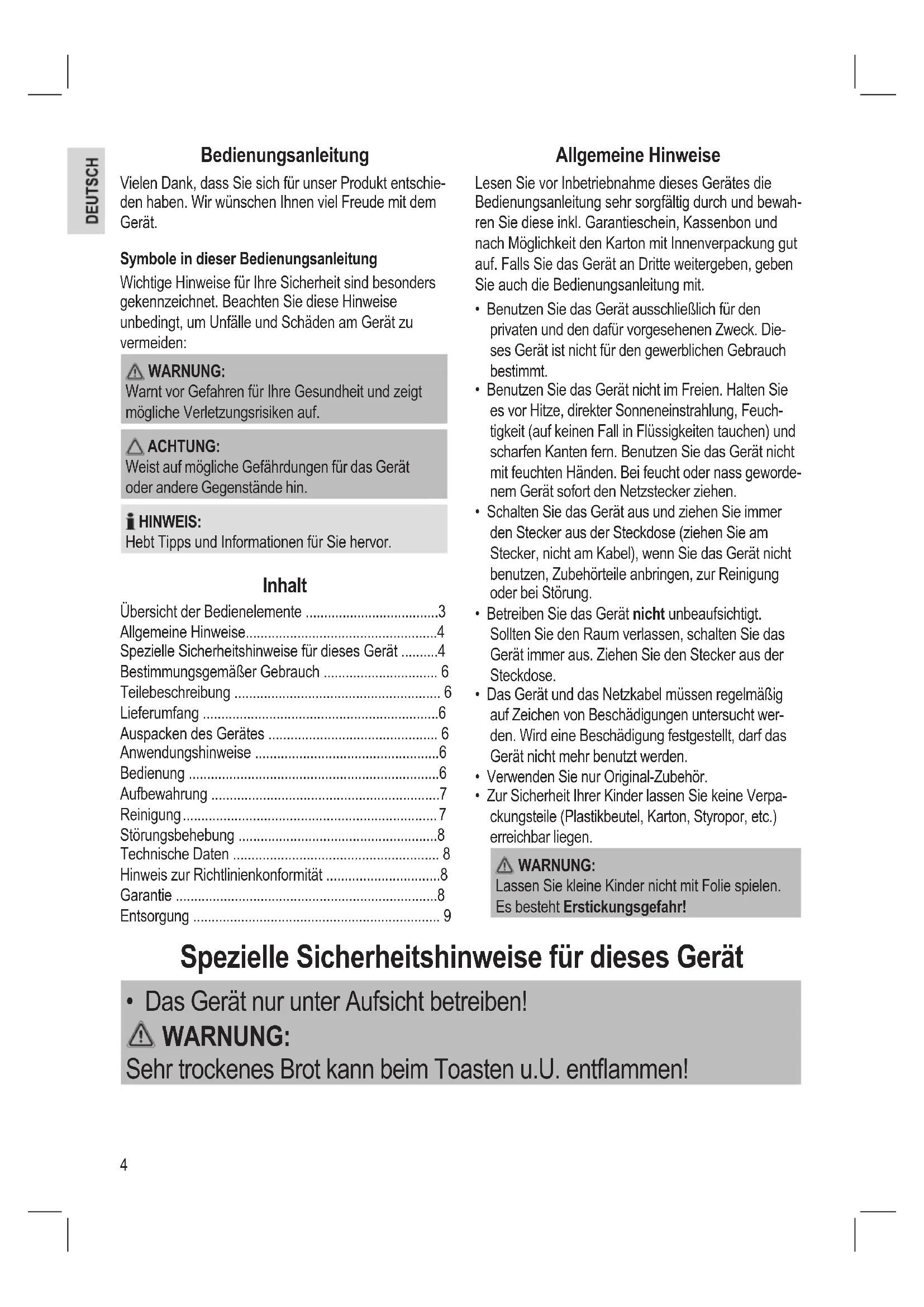 - Das Gerät nur unter Aufsicht betreiben! WARNUNG: Sehr trockenes Brot kann beim Toasten u.U. entammen!5