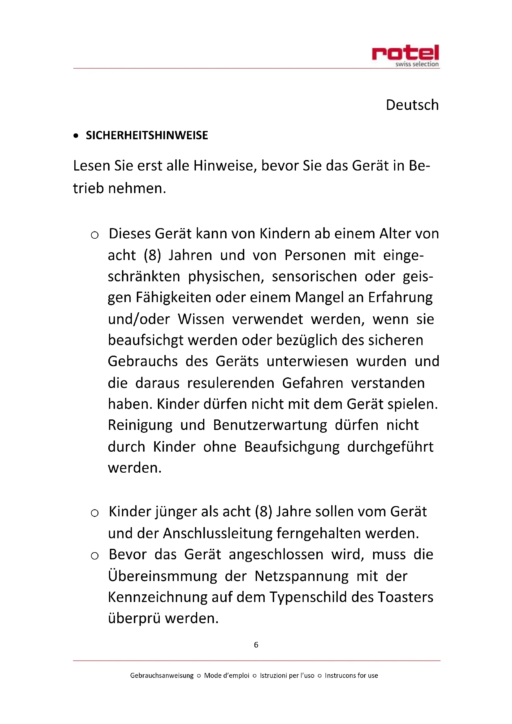 - Bevor das Gerät angeschlossen wird, muss die Übereinsmmung der Netzspannung mit der Kennzeichnung auf dem Typenschild des Toasters überprü werden.