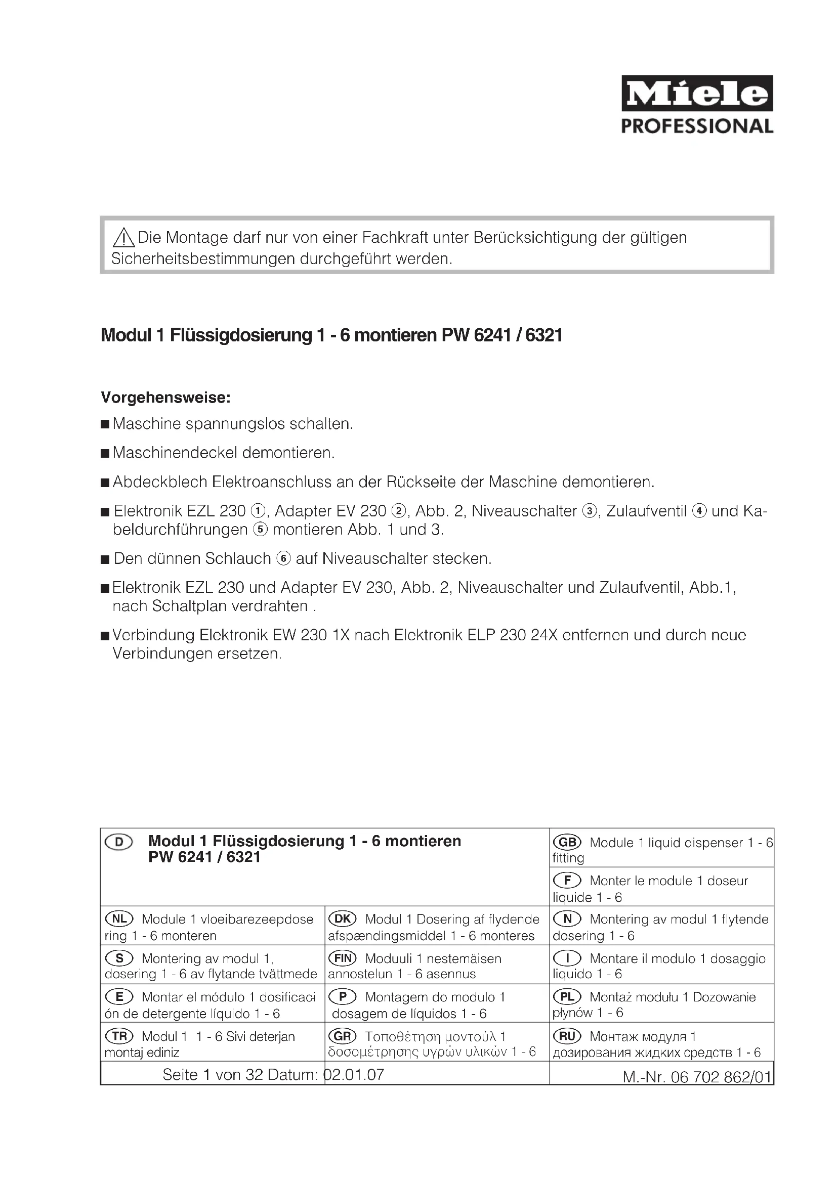 Die Montage darf nur von einer Fachkraft unter Berücksichtigung der gültigen Sicherheitsbestimmungen durchgeführt werden. Modul 1 Flüssigdosierung1-6montieren PW 6241 / 6321 Vorgehensweise: