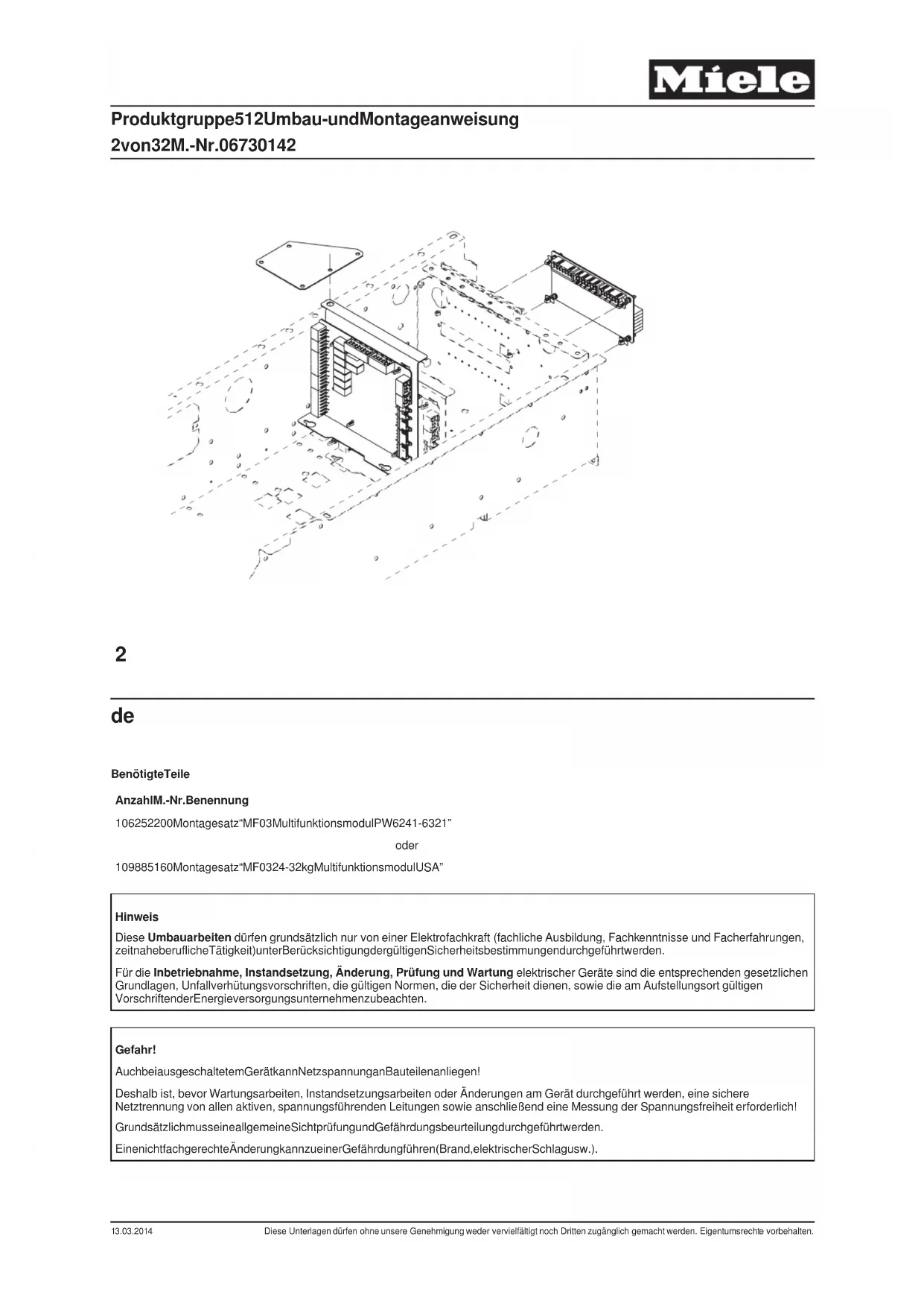 Anzahl M.-Nr. Benennung 1 06252200 Montagesatz “MF03 Multifunktionsmodul PW6241-6321” oder 1 09885160 Montagesatz “MF03 24-32 kg Multifunktionsmodul USA” Hinweis Diese Umbauarbeiten dürfen grundsätzlich nur von einer Elektrofachkraft (fachliche Ausbildung, Fachkenntnisse und Facherfahrungen, zeitnahe berufliche Tätigkeit) unter Berücksichtigung der gültigen Sicherheitsbestimmungen durchgeführt werden. Für die Inbetriebnahme, Instandsetzung, Änderung, Prüfung und Wartung elektrischer Geräte sind die entsprechenden gesetzlichen Grundlagen, Unfallverhütungsvorschriften, die gültigen Normen, die der Sicherheit dienen, sowie die am Aufstellungsort gültigen Vorschriften der Energieversorgungsunternehmen zu beachten. Gefahr! Auch bei ausgeschaltetem Gerät kann Netzspannung an Bauteilen anliegen! Deshalb ist, bevor Wartungsarbeiten, Instandsetzungsarbeiten oder Änderungen am Gerät durchgeführ t werden, eine sichere Netztrennung von allen aktiven, spannungsführenden Leitungen sowie anschließend eine Messung der Spannungsfreiheit erforderlich! Grundsätzlich muss eine allgemeine Sichtprüfung und Gefährdungsbeurteilung durchgeführt werden. Eine nicht fachgerechte Änderung kann zu einer Gefährdung führen (Brand, elektrischer Schlag usw.). Produktgruppe 512 Umbau- und Montageanweisung 2 von 32 M.-Nr. 06730142 13.03.2014 Diese Unterlagen dürfen ohne unsere Genehmigung weder vervielfältigt noch Dritten zugänglich gemacht werden. Eigentumsrechte vorbehalten.Gefahr! Die Schutzleiterfunktion kann durch einen fehlerhaften Gehäusezusammenbau außer Kraft gesetzt werden. Die Schutzleiterfunktion ist bei Montage der Gehäuseteile wieder herzustellen. Elektrische Sicherheitsprüfung durchführen. Gefahr! Bei der Montage dürfen berührbare leitfähige Teile, die nicht am Schutzleiter angeschlossen sind, keine Schutzleiterverbindung haben (verstärkte, doppelte Isolierung). Der Nachweis ist durch Messen des ordnungsgemäßen Isolationswiderstandes und Berührungsstromes nachzuweisen. Hinweis Der Montagesatz M.-Nr.06197490 für PW 6241, PW 6321 enthält: