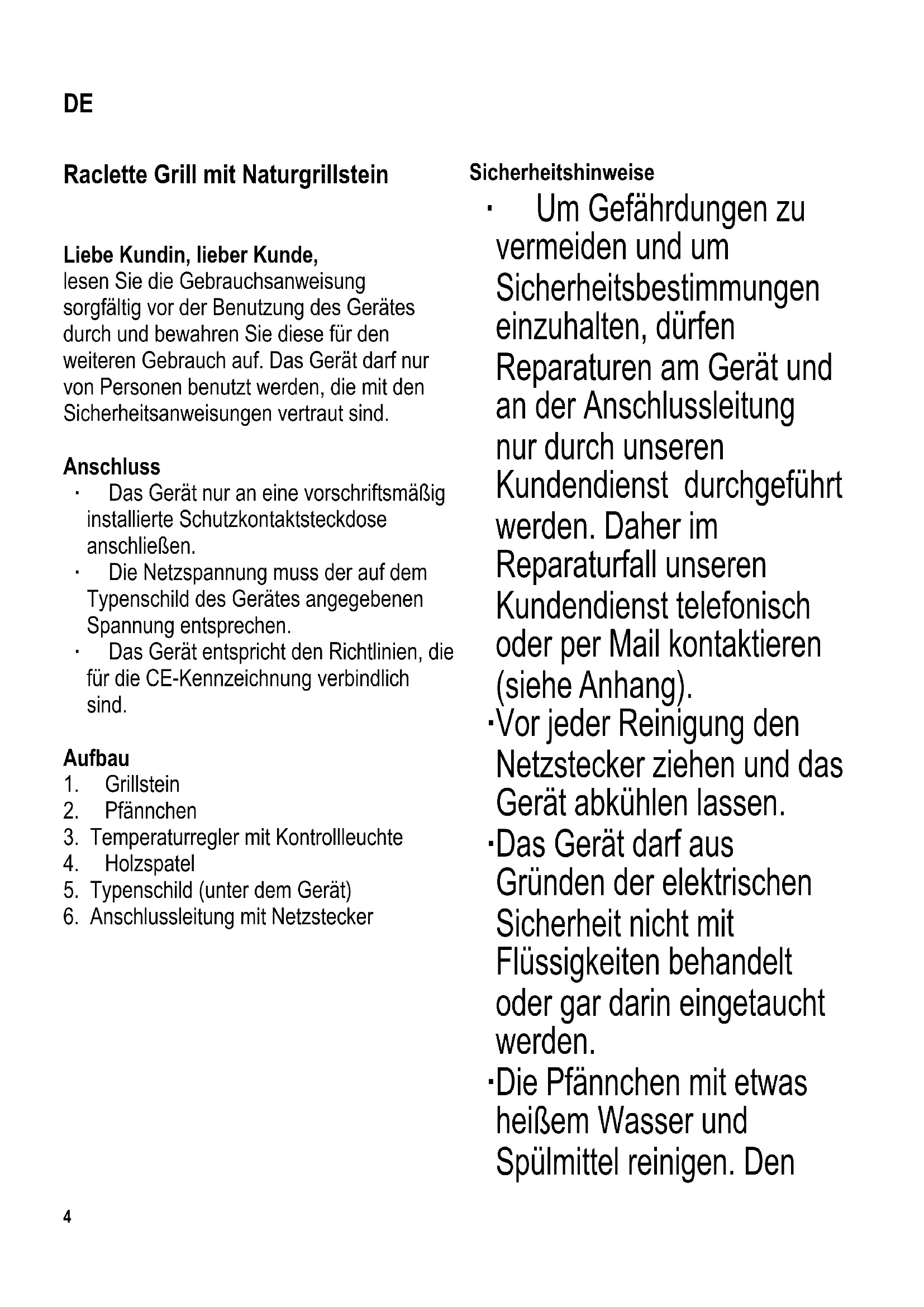 Raclette Grill mit Naturgrillstein Liebe Kundin, lieber Kunde, lesen Sie die Gebrauchsanweisung sorgfältig vor der Benutzung des Gerätes durch und bewahren Sie diese für den weiteren Gebrauch auf. Das Gerät darf nur von Personen benutzt werden, die mit den Sicherheitsanweisungen vertraut sind. Anschluss ∙ Das Gerät nur an eine vorschriftsmäßig installierte Schutzkontaktsteckdose anschließen. ∙ Die Netzspannung muss der auf dem Typenschild des Gerätes angegebenen Spannung entsprechen. ∙ Das Gerät entspricht den Richtlinien, die für die CE-Kennzeichnung verbindlich sind. Aufbau