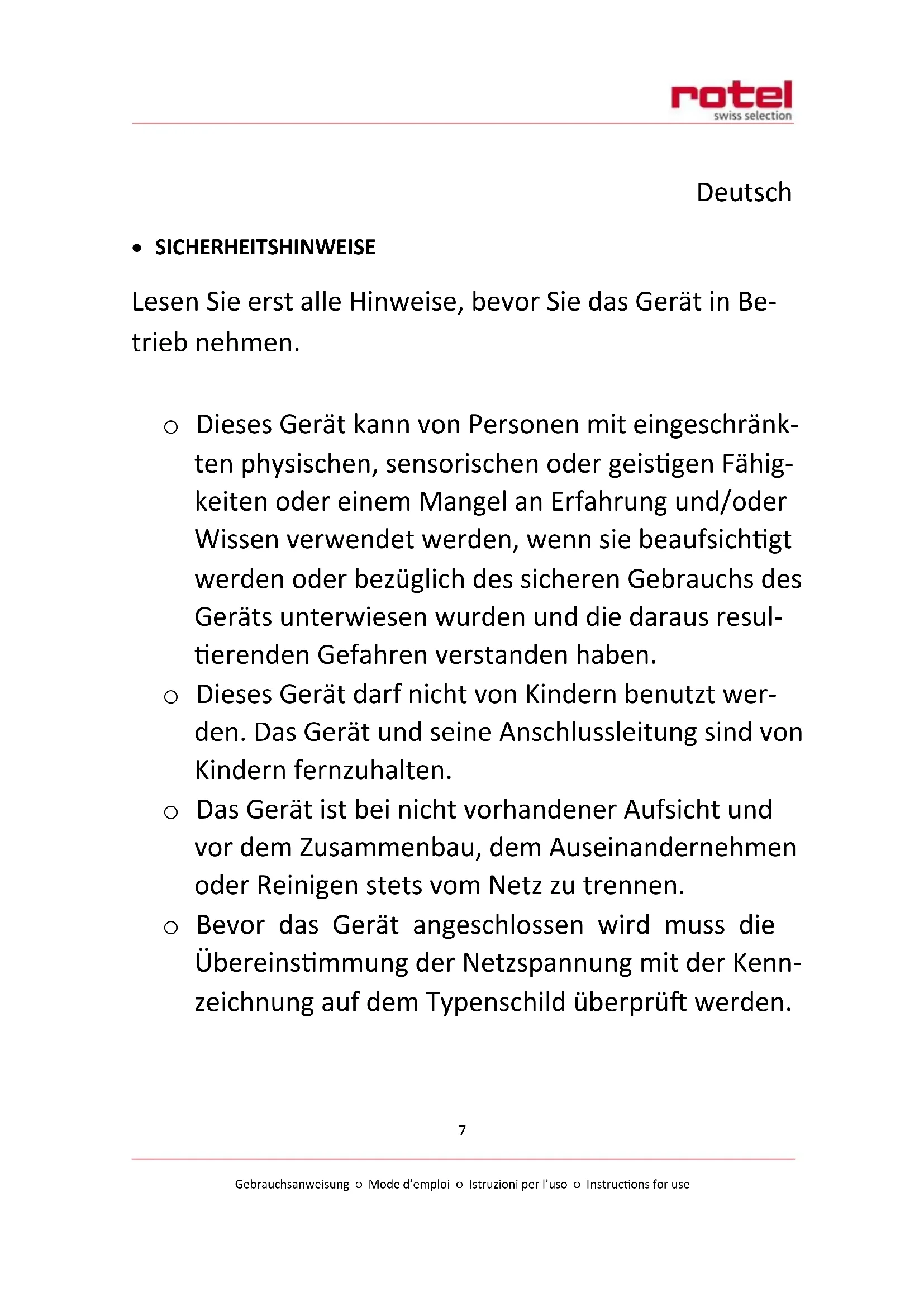 - Zur ordnungsgemässen Entsorgung geben Sie das Gerät bitte an einen Händler, den Kundendienst oder Rotel AG zurück.