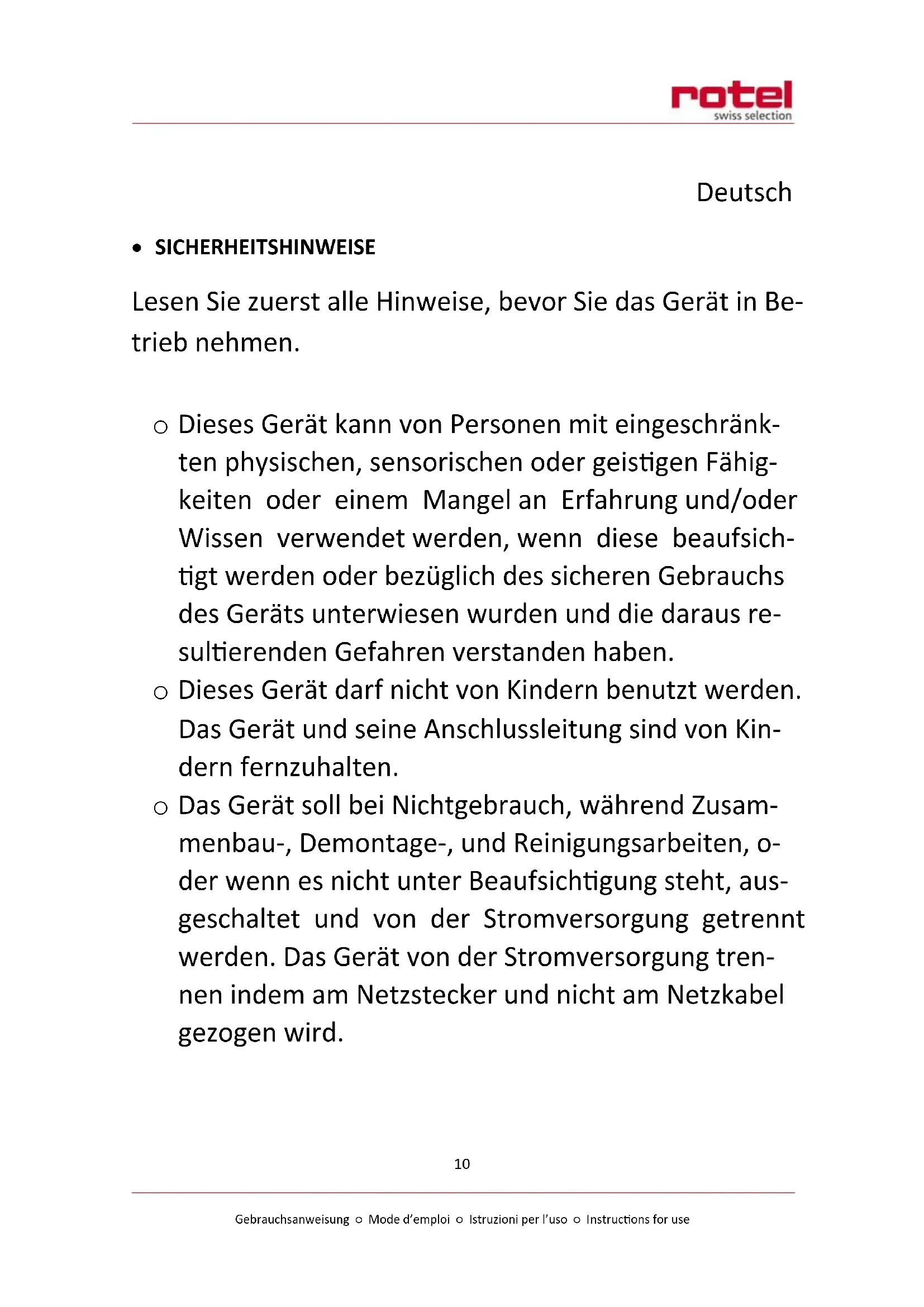 - Zur ordnungsgemässen Entsorgung geben Sie das Gerät bitte an einen Händler, den Kundendienst oder Rotel AG zurück.