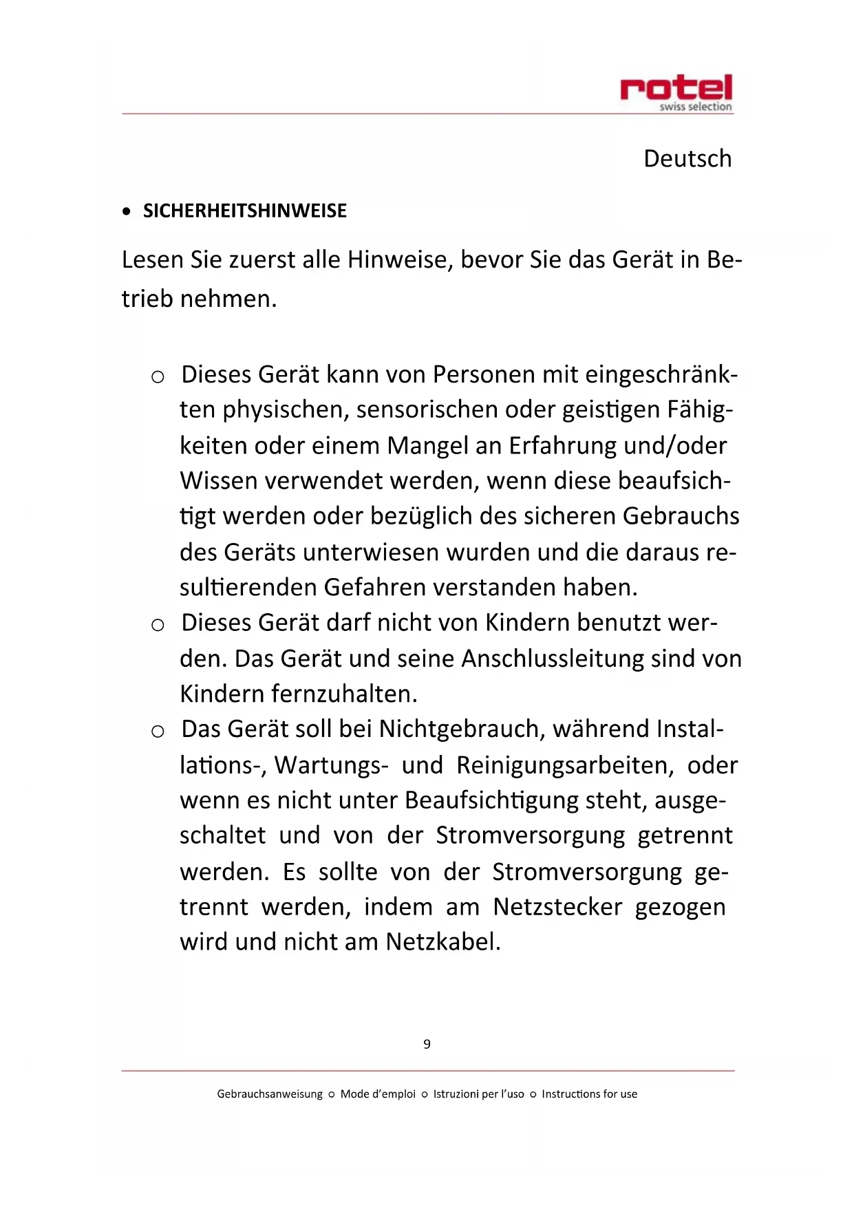 Deutsch SICHERHEITSHINWEISE Lesen Sie zuerst alle Hinweise, bevor Sie das Gerät in Be- trieb nehmen. o Dieses Gerät kann von Personen mit eingeschränk- ten physischen, sensorischen oder geistigen Fähig- keiten oder einem Mangel an Erfahrung und/oder Wissen verwendet werden, wenn diese beaufsich- tigt werden oder bezüglich des sicheren Gebrauchs des Geräts unterwiesen wurden und die daraus re- sultierenden Gefahren verstanden haben. o Dieses Gerät darf nicht von Kindern benutzt wer- den. Das Gerät und seine Anschlussleitung sind von Kindern fernzuhalten. o Das Gerät soll bei Nichtgebrauch, während Instal- lations-, Wartungs- und Reinigungsarbeiten, oder wenn es nicht unter Beaufsichtigung steht, ausge- schaltet und von der Stromversorgung getrennt werden. Es sollte von der Stromversorgung ge- trennt werden, indem am Netzstecker gezogen wird und nicht am Netzkabel.Gebrauchsanweisung ○ Mode d’emploi ○ Istruzioni per l’uso ○ Instructions for use