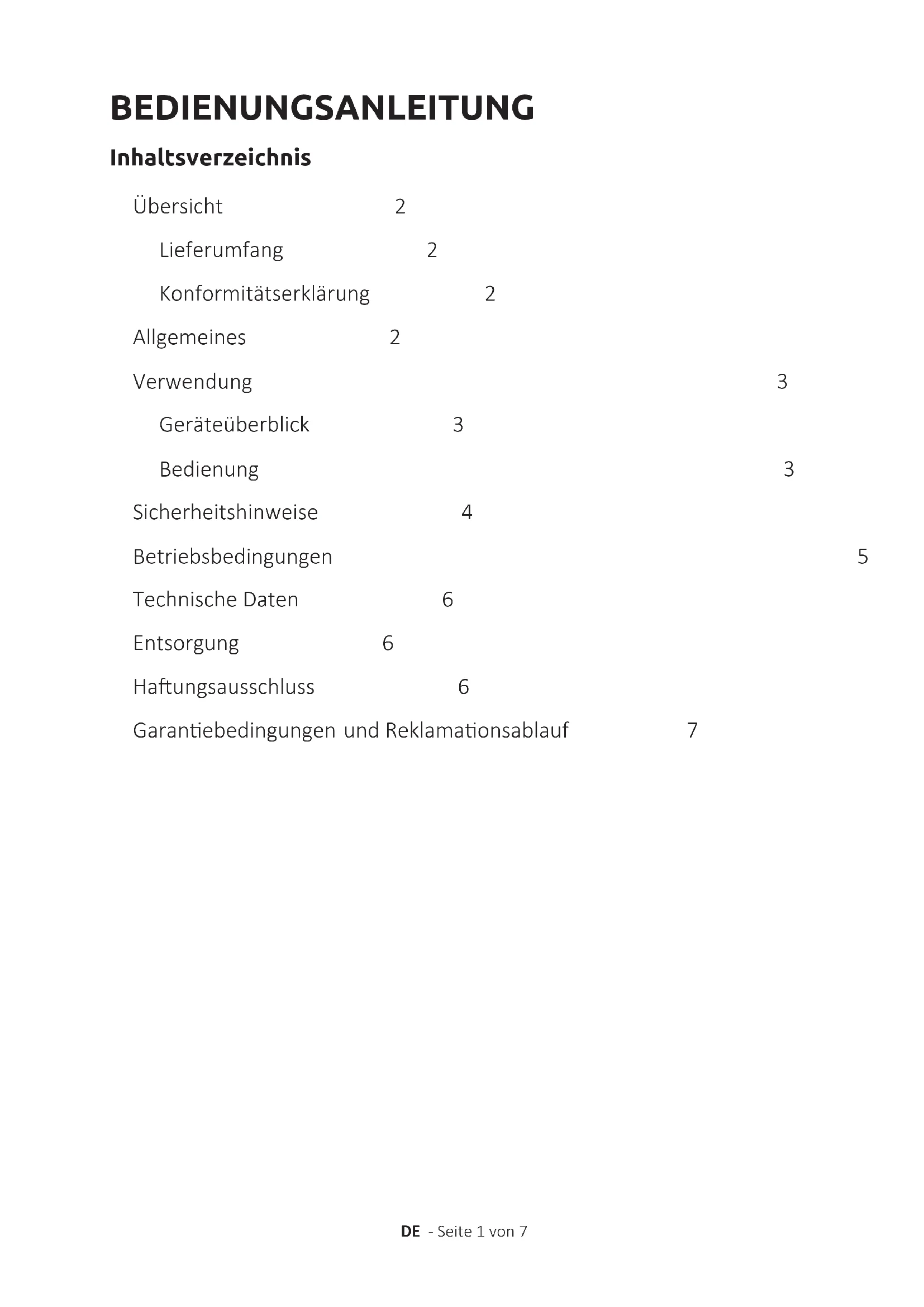 RU инструкцияпоэксплуатации Стр. 1- 7BEDIENUNGSANLEITUNG DE -Seite1von7 Inhaltsverzeichnis Übersicht 2 Lieferumfang 2 Konformitätserklärung 2 Allgemeines 2 Verwendung 3 Geräteüberblick 3 Bedienung 3 Sicherheitshinweise 4 Betriebsbedingungen 5 TechnischeDaten 6 Entsorgung 6 Haungsausschluss 6 GaranebedingungenundReklamaonsablauf 7DE -Seite1von7 DE-Seite2von7