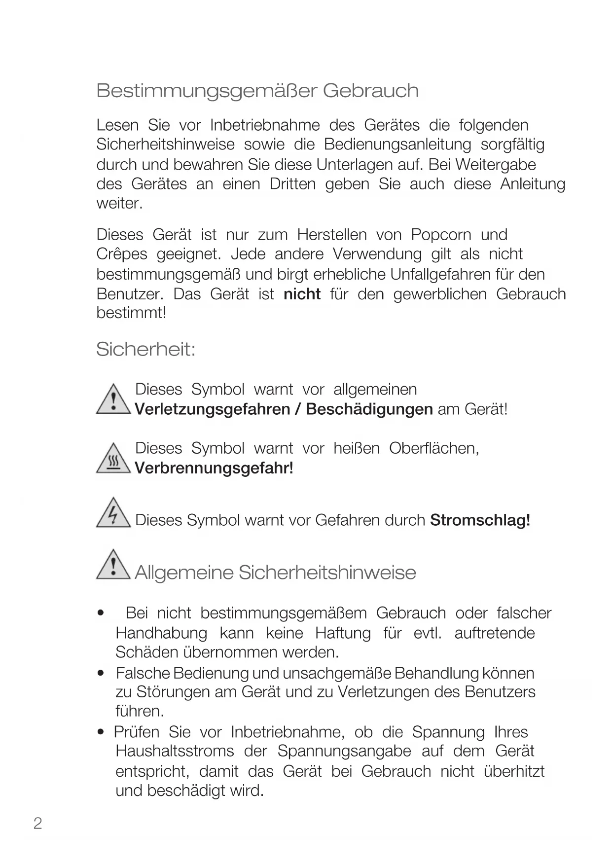 Bestimmungsgemäßer Gebrauch Lesen Sie vor Inbetriebnahme des Gerätes die folgenden Sicherheitshinweise sowie die Bedienungsanleitung sorgfältig durch und bewahren Sie diese Unterlagen auf. Bei Weitergabe des Gerätes an einen Dritten geben Sie auch diese Anleitung weiter. Dieses Gerät ist nur zum Herstellen von Popcorn und Crêpes geeignet. Jede andere Verwendung gilt als nicht bestimmungsgemäß und birgt erhebliche Unfallgefahren für den Benutzer. Das Gerät ist nicht für den gewerblichen Gebrauch bestimmt! Sicherheit: Dieses Symbol warnt vor allgemeinen Verletzungsgefahren / Beschädigungen am Gerät! Dieses Symbol warnt vor heißen Oberflächen, Verbrennungsgefahr! Dieses Symbol warnt vor Gefahren durch Stromschlag! Allgemeine Sicherheitshinweise