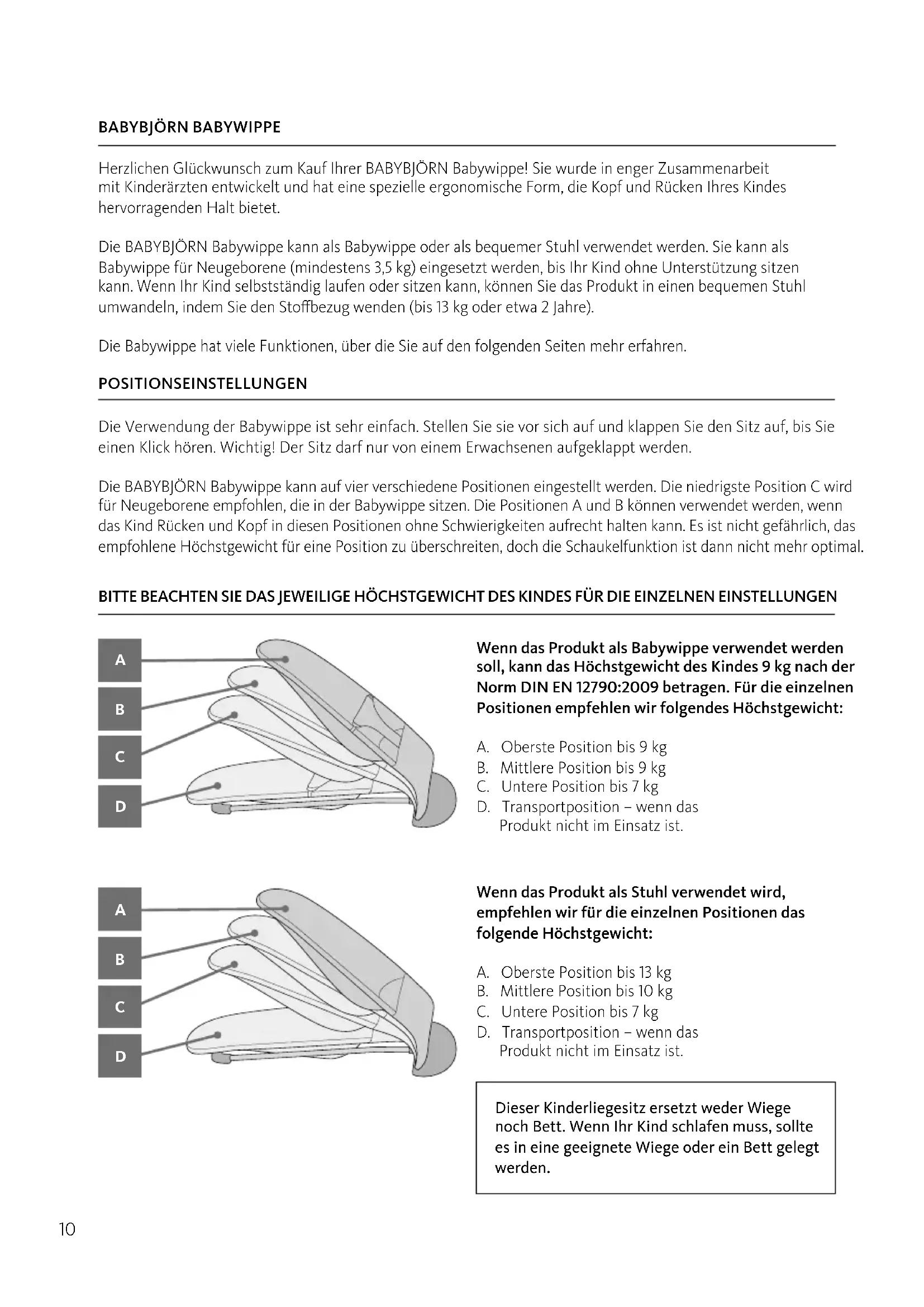 Herzlichen Glückwunsch zum Kauf Ihrer BABYBJÖRN Babywippe! Sie wurde in enger Zusammenarbeit mit Kinderärzten entwickelt und hat eine spezielle ergonomische Form, die Kopf und Rücken Ihres Kindes hervorragenden Halt bietet. Die BABYBJÖRN Babywippe kann als Babywippe oder als bequemer Stuhl verwendet werden. Sie kann als Babywippe für Neugeborene (mindestens 3,5 kg) eingesetzt werden, bis Ihr Kind ohne Unterstützung sitzen kann. Wenn Ihr Kind selbstständig laufen oder sitzen kann, können Sie das Produkt in einen bequemen Stuhl umwandeln, indem Sie den Stobezug wenden (bis 13 kg oder etwa 2 Jahre). Die Babywippe hat viele Funktionen, über die Sie auf den folgenden Seiten mehr erfahren. Wenn das Produkt als Babywippe verwendet werden soll, kann das Höchstgewicht des Kindes 9 kg nach der Norm DIN EN 12790:2009 betragen. Für die einzelnen Positionen empfehlen wir folgendes Höchstgewicht: A. Oberste Position bis 9 kg B. Mittlere Position bis 9 kg C. Untere Position bis 7 kg D. Transportposition – wenn das Produkt nicht im Einsatz ist. BITTE BEACHTEN SIE DAS JEWEILIGE HÖCHSTGEWICHT DES KINDES FÜR DIE EINZELNEN EINSTELLUNGEN Wenn das Produkt als Stuhl verwendet wird, empfehlen wir für die einzelnen Positionen das folgende Höchstgewicht: A. Oberste Position bis 13 kg B. Mittlere Position bis 10 kg C. Untere Position bis 7 kg D. Transportposition – wenn das Produkt nicht im Einsatz ist. POSITIONSEINSTELLUNGEN Die Verwendung der Babywippe ist sehr einfach. Stellen Sie sie vor sich auf und klappen Sie den Sitz auf, bis Sie einen Klick hören. Wichtig! Der Sitz darf nur von einem Erwachsenen aufgeklappt werden. Die BABYBJÖRN Babywippe kann auf vier verschiedene Positionen eingestellt werden. Die niedrigste Position C wird für Neugeborene empfohlen, die in der Babywippe sitzen. Die Positionen A und B können verwendet werden, wenn das Kind Rücken und Kopf in diesen Positionen ohne Schwierigkeiten aufrecht halten kann. Es ist nicht gefährlich, das empfohlene Höchstgewicht für eine Position zu überschreiten, doch die Schaukelfunktion ist dann nicht mehr optimal. Dieser Kinderliegesitz ersetzt weder Wiege noch Bett. Wenn Ihr Kind schlafen muss, sollte es in eine geeignete Wiege oder ein Bett gelegt werden.11