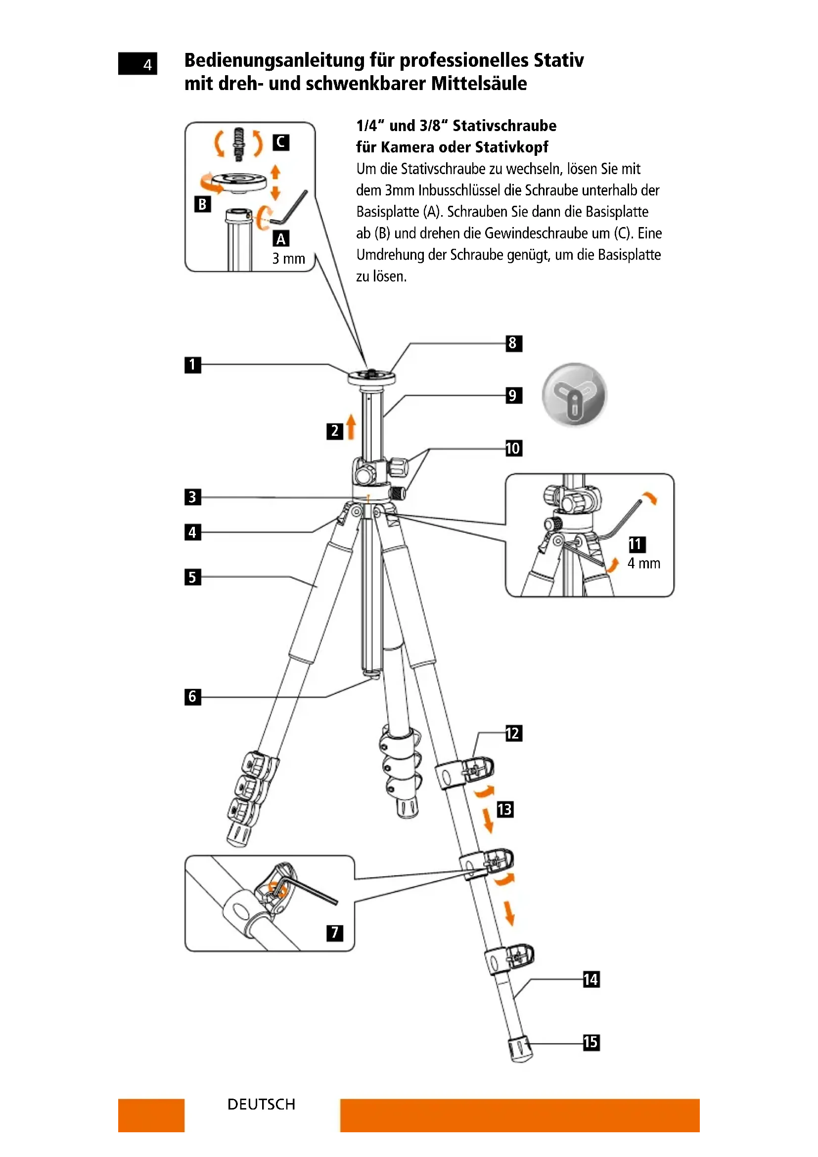 - 用户手册 Rock Solid Tripods Beta and Gamma 180 Carbon or Aluminium www.rollei.com334 Bedienungsanleitung für professionelles Stativ mit dreh- und schwenkbarer Mittelsäule 1/4“ und 3/8“ Stativschraube für Kamera oder Stativkopf Um die Stativschraube zu wechseln, lösen Sie mit dem 3mm Inbusschlüssel die Schraube unterhalb der Basisplatte (A). Schrauben Sie dann die Basisplatte ab (B) und drehen die Gewindeschraube um (C). Eine Umdrehung der Schraube genügt, um die Basisplatte zu lösen. p. 32