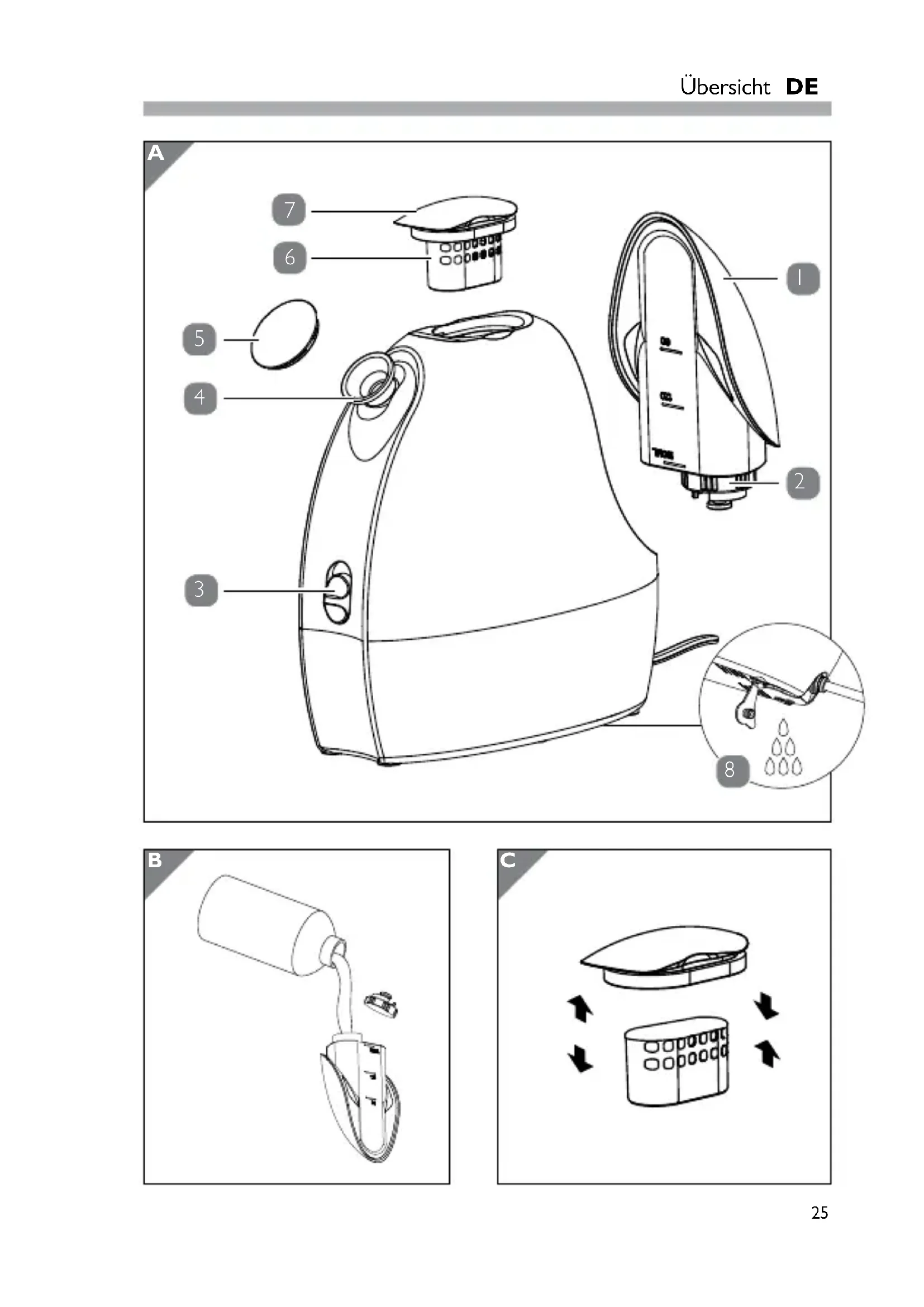 Schrauben Sie den Deckel 2 ab und füllen Sie destilliertes Wasser in den Wassertank. Orientieren Sie sich an der Skala am Wassertank (siehe Abb. B).