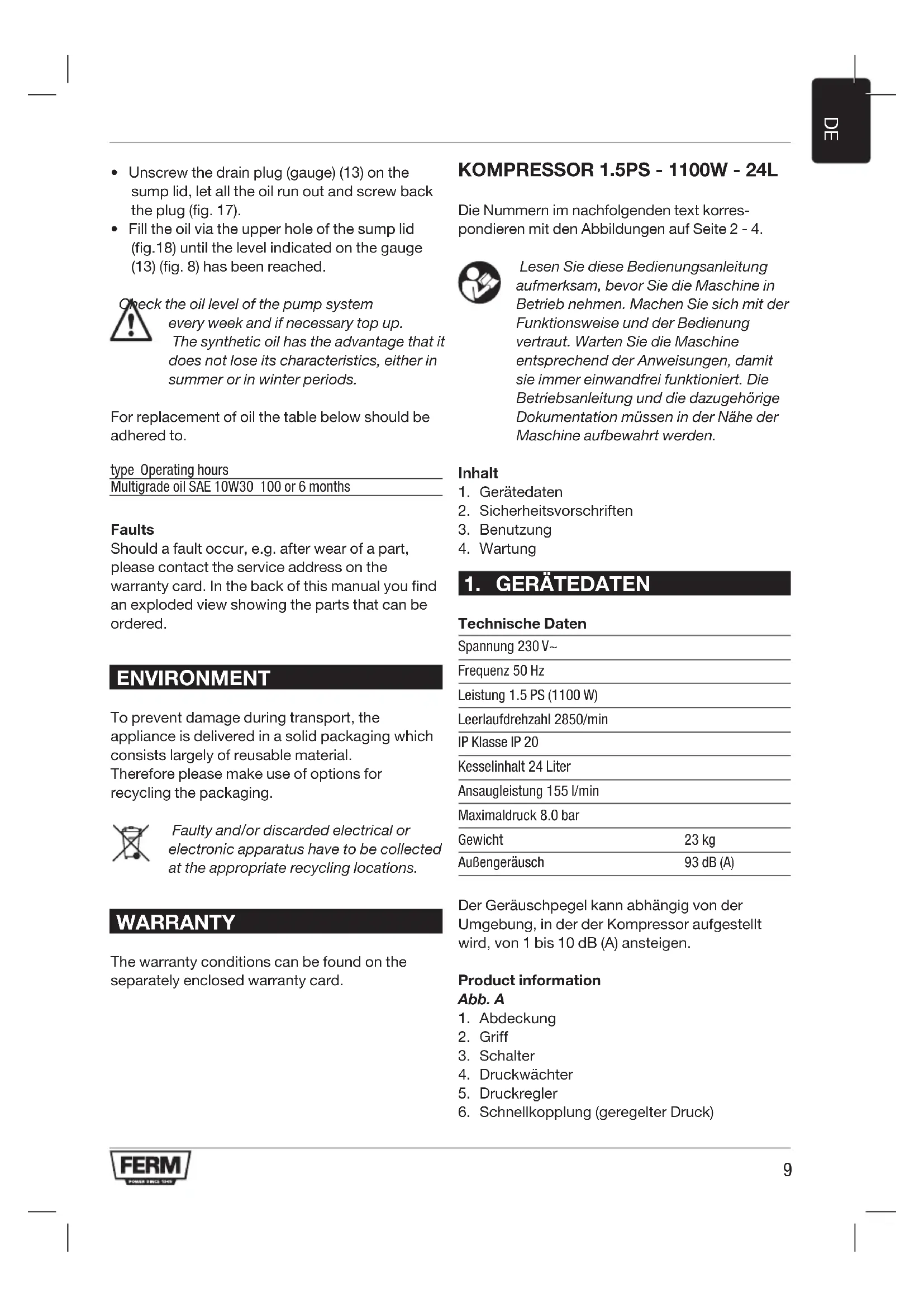 Technische Daten Spannung 230 V~ Frequenz 50 Hz Leistung 1.5 PS (1100 W) Leerlaufdrehzahl 2850/min IP Klasse IP 20 Kesselinhalt 24 Liter Ansaugleistung 155 l/min Maximaldruck 8.0 bar Gewicht 23 kg Außengeräusch 93 dB (A) Der Geräuschpegel kann abhängig von der Umgebung, in der der Kompressor aufgestellt wird, von 1 bis 10 dB (A) ansteigen. Product information Abb. A