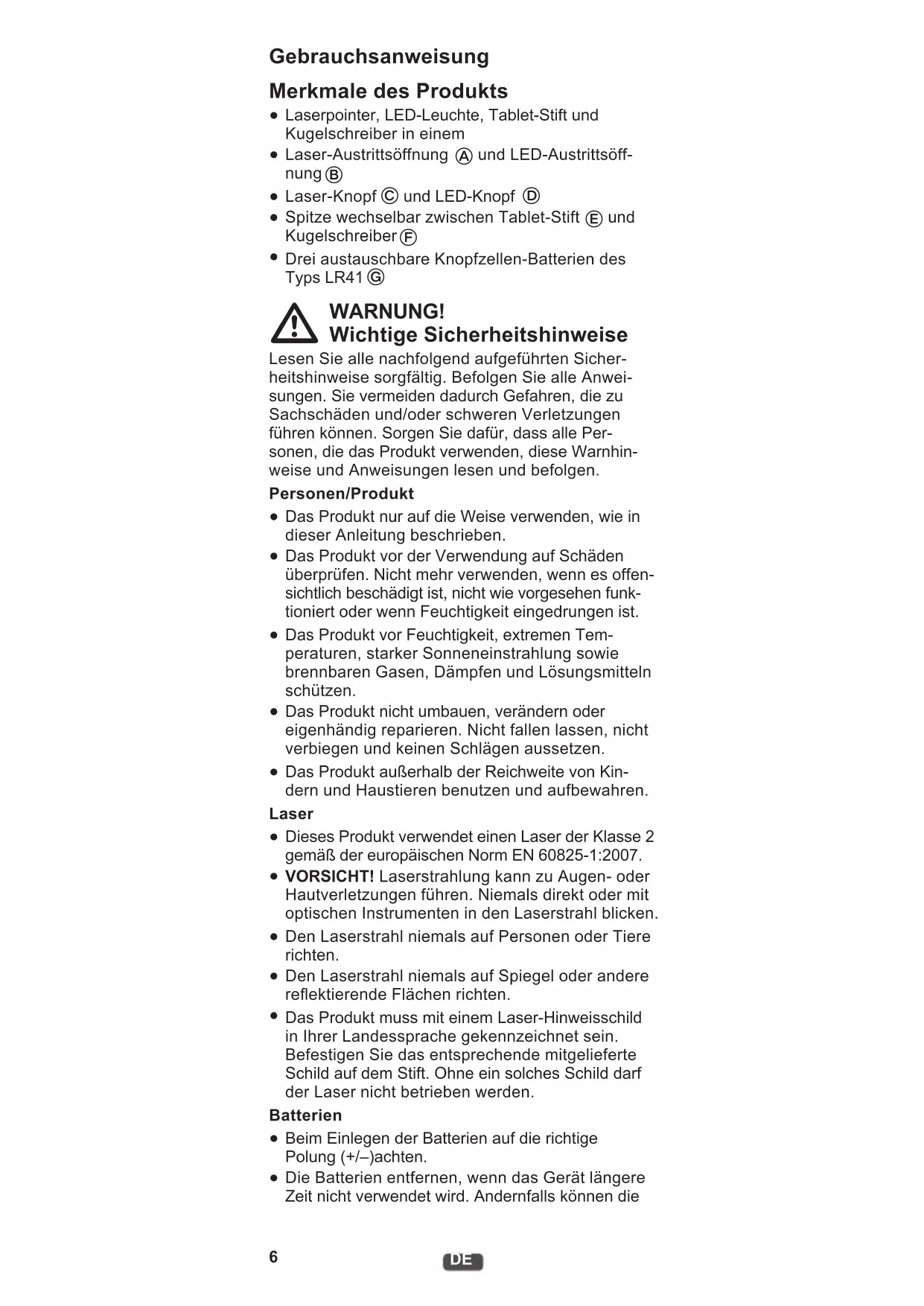 Das Produkt muss mit einem Laser-Hinweisschild in Ihrer Landessprache gekennzeichnet sein. Befestigen Sie das entsprechende mitgelieferte Schild auf dem Stift. Ohne ein solches Schild darf der Laser nicht betrieben werden. Batterien