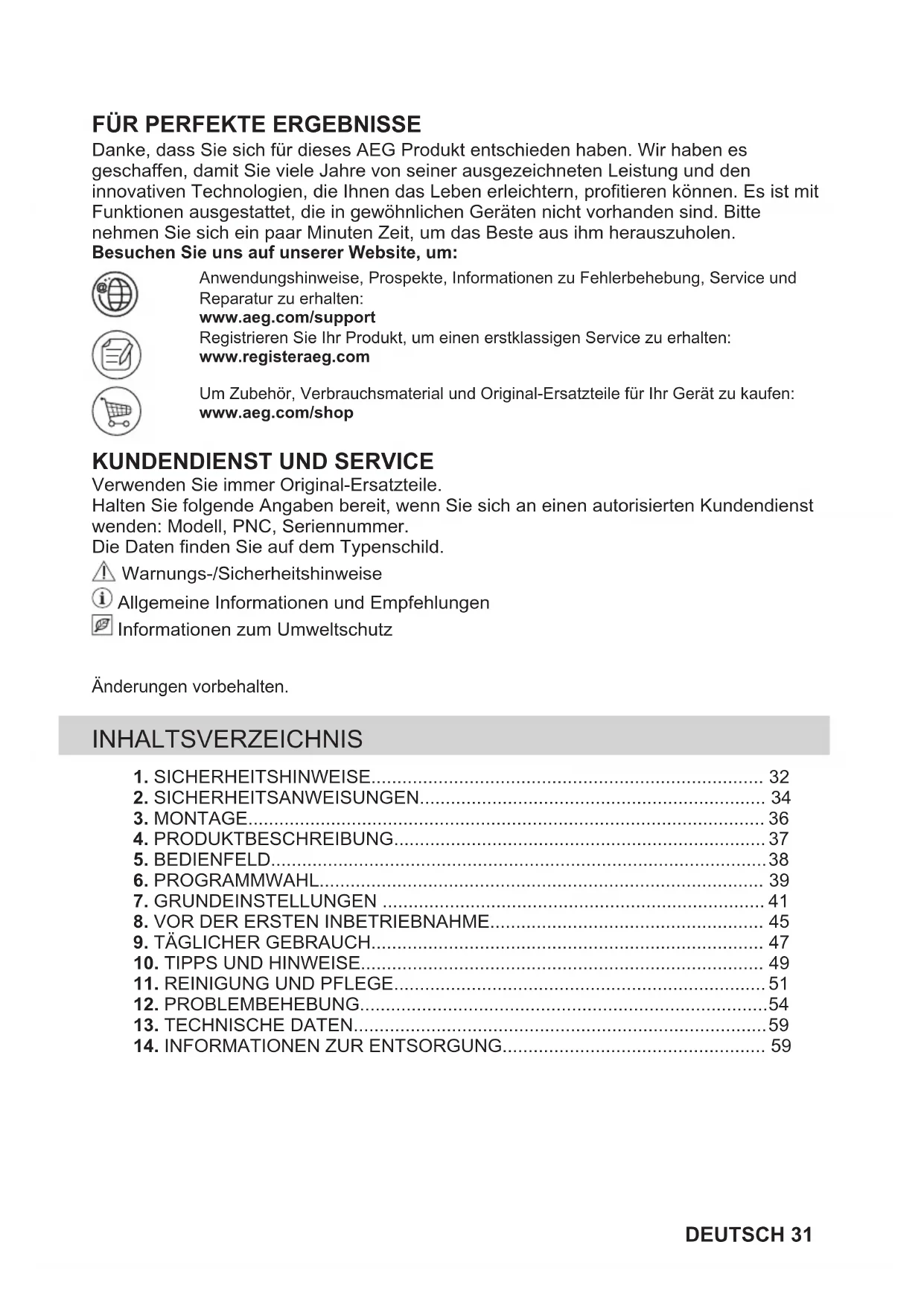 Danke, dass Sie sich für dieses AEG Produkt entschieden haben. Wir haben es geschaffen, damit Sie viele Jahre von seiner ausgezeichneten Leistung und den innovativen Technologien, die Ihnen das Leben erleichtern, profitieren können. Es ist mit Funktionen ausgestattet, die in gewöhnlichen Geräten nicht vorhanden sind. Bitte nehmen Sie sich ein paar Minuten Zeit, um das Beste aus ihm herauszuholen. Besuchen Sie uns auf unserer Website, um: Anwendungshinweise, Prospekte, Informationen zu Fehlerbehebung, Service undReparatur zu erhalten:www.aeg.com/supportRegistrieren Sie Ihr Produkt, um einen erstklassigen Service zu erhalten:www.registeraeg.comUm Zubehör, Verbrauchsmaterial und Original-Ersatzteile für Ihr Gerät zu kaufen:www.aeg.com/shop