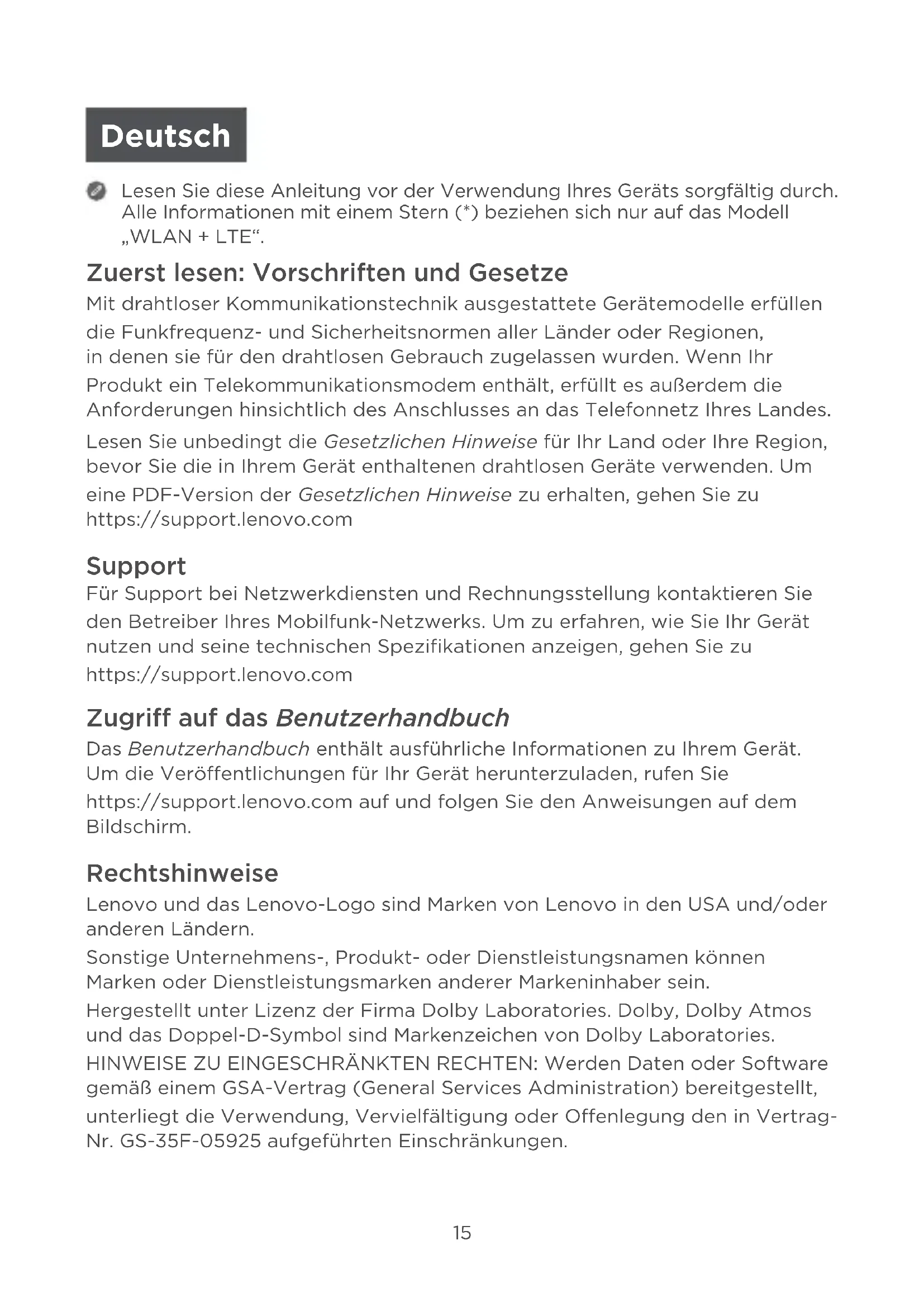 Zuerst lesen: Vorschriften und Gesetze Mit drahtloser Kommunikationstechnik ausgestattete Gerätemodelle erfüllen die Funkfrequenz- und Sicherheitsnormen aller Länder oder Regionen, in denen sie für den drahtlosen Gebrauch zugelassen wurden. Wenn Ihr Produkt ein Telekommunikationsmodem enthält, erfüllt es außerdem die Anforderungen hinsichtlich des Anschlusses an das Telefonnetz Ihres Landes. Lesen Sie unbedingt die Gesetzlichen Hinweise für Ihr Land oder Ihre Region, bevor Sie die in Ihrem Gerät enthaltenen drahtlosen Geräte verwenden. Um eine PDF-Version der Gesetzlichen Hinweise zu erhalten, gehen Sie zu https://support.lenovo.com Support Für Support bei Netzwerkdiensten und Rechnungsstellung kontaktieren Sie den Betreiber Ihres Mobilfunk-Netzwerks. Um zu erfahren, wie Sie Ihr Gerät nutzen und seine technischen Spezifikationen anzeigen, gehen Sie zu https://support.lenovo.com Zugriff auf das Benutzerhandbuch Das Benutzerhandbuch enthält ausführliche Informationen zu Ihrem Gerät. Um die Veröentlichungen für Ihr Gerät herunterzuladen, rufen Sie https://support.lenovo.com auf und folgen Sie den Anweisungen auf dem Bildschirm. Rechtshinweise Lenovo und das Lenovo-Logo sind Marken von Lenovo in den USA und/oder anderen Ländern. Sonstige Unternehmens-, Produkt- oder Dienstleistungsnamen können Marken oder Dienstleistungsmarken anderer Markeninhaber sein. Hergestellt unter Lizenz der Firma Dolby Laboratories. Dolby, Dolby Atmos und das Doppel-D-Symbol sind Markenzeichen von Dolby Laboratories. HINWEISE ZU EINGESCHRÄNKTEN RECHTEN: Werden Daten oder Software gemäß einem GSA-Vertrag (General Services Administration) bereitgestellt, unterliegt die Verwendung, Vervielfältigung oder Oenlegung den in Vertrag- Nr. GS-35F-05925 aufgeführten Einschränkungen. Deutsch16 Geräteübersicht Modell Version Lenovo YT-X705F WLAN Lenovo YT-X705L LTE Lenovo YT-X705X LTE+Voice-Funktion