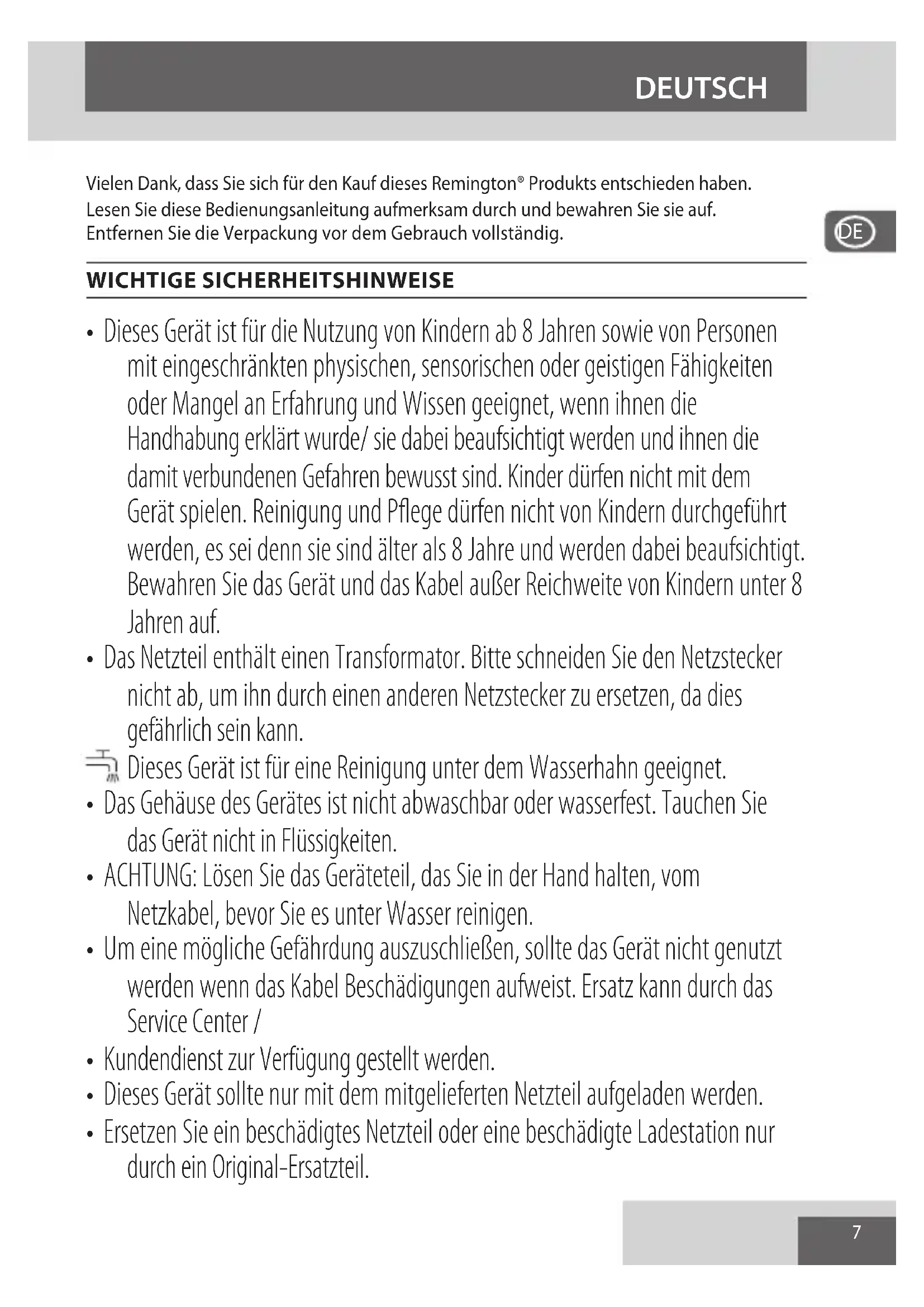 To avoid environmental and health problems due to hazardous substances, appliances and rechargeable and non-rechargeable batteries marked with one of these symbols must not be disposed of with unsorted municipal waste. Always dispose of electrical and electronic products and, where applicable, rechargeable and non-rechargeable batteries, at an appropriate ocial recycling/ collection point. ENGLISH7 Vielen Dank, dass Sie sich für den Kauf dieses Remington® Produkts entschieden haben. Lesen Sie diese Bedienungsanleitung aufmerksam durch und bewahren Sie sie auf. Entfernen Sie die Verpackung vor dem Gebrauch vollständig. WICHTIGE SICHERHEITSHINWEISE