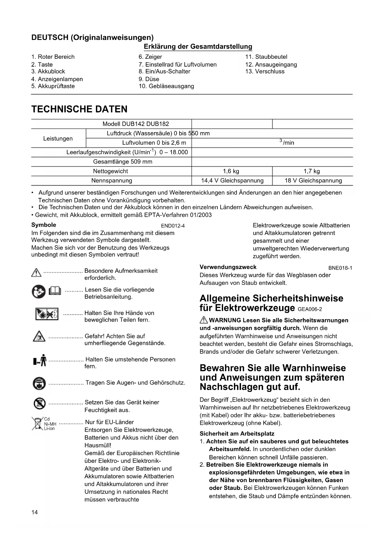 SICHERHEITSHINWEISE ZUM KABELLOSES GEBLASE / AKKUGARTENGEBLASE / SAUGER