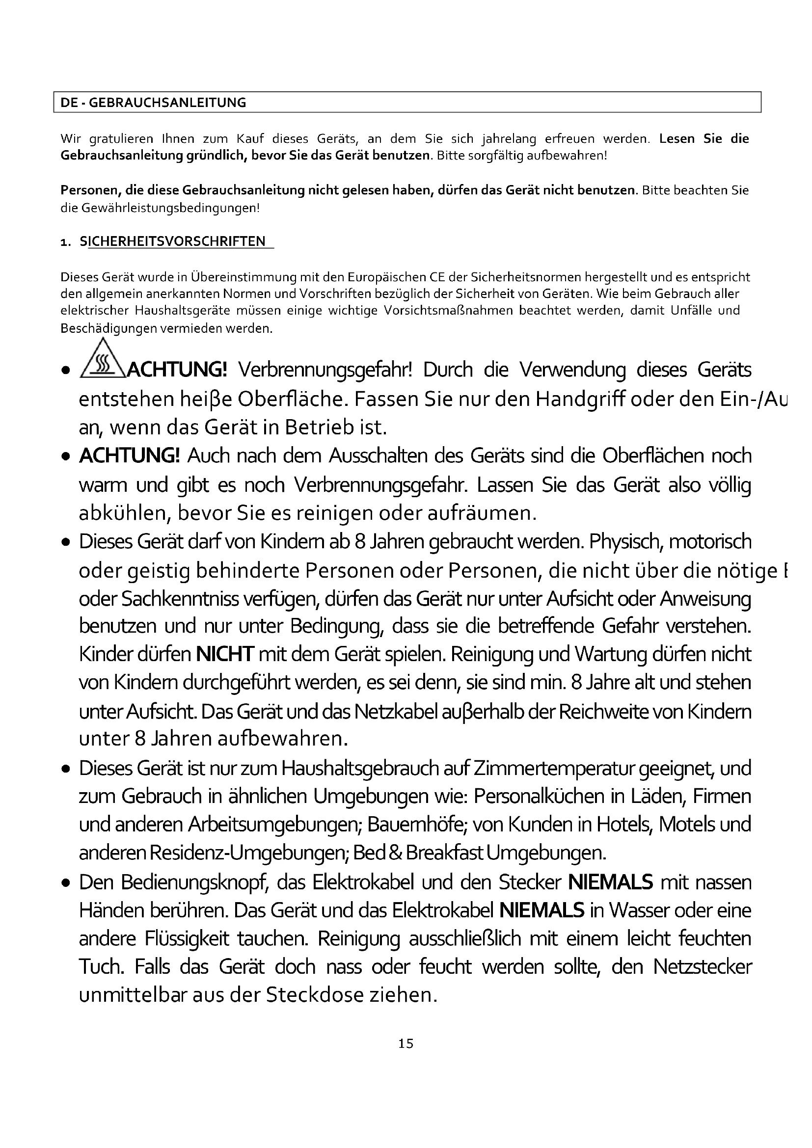 - Den Bedienungsknopf, das Elektrokabel und den Stecker NIEMALS mit nassen Händen berühren. Das Gerät und das Elektrokabel NIEMALS in Wasser oder eine andere Flüssigkeit tauchen. Reinigung ausschließlich mit einem leicht feuchten Tuch. Falls das Gerät doch nass oder feucht werden sollte, den Netzstecker unmittelbar aus der Steckdose ziehen.16