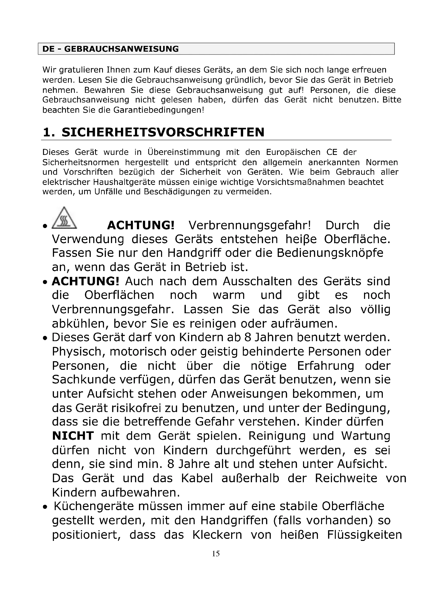 - ACHTUNG! Verbrennungsgefahr! Durch die Verwendung dieses Geräts entstehen heiβe Oberfläche. Fassen Sie nur den Handgriff oder die Bedienungsknöpfe an, wenn das Gerät in Betrieb ist.