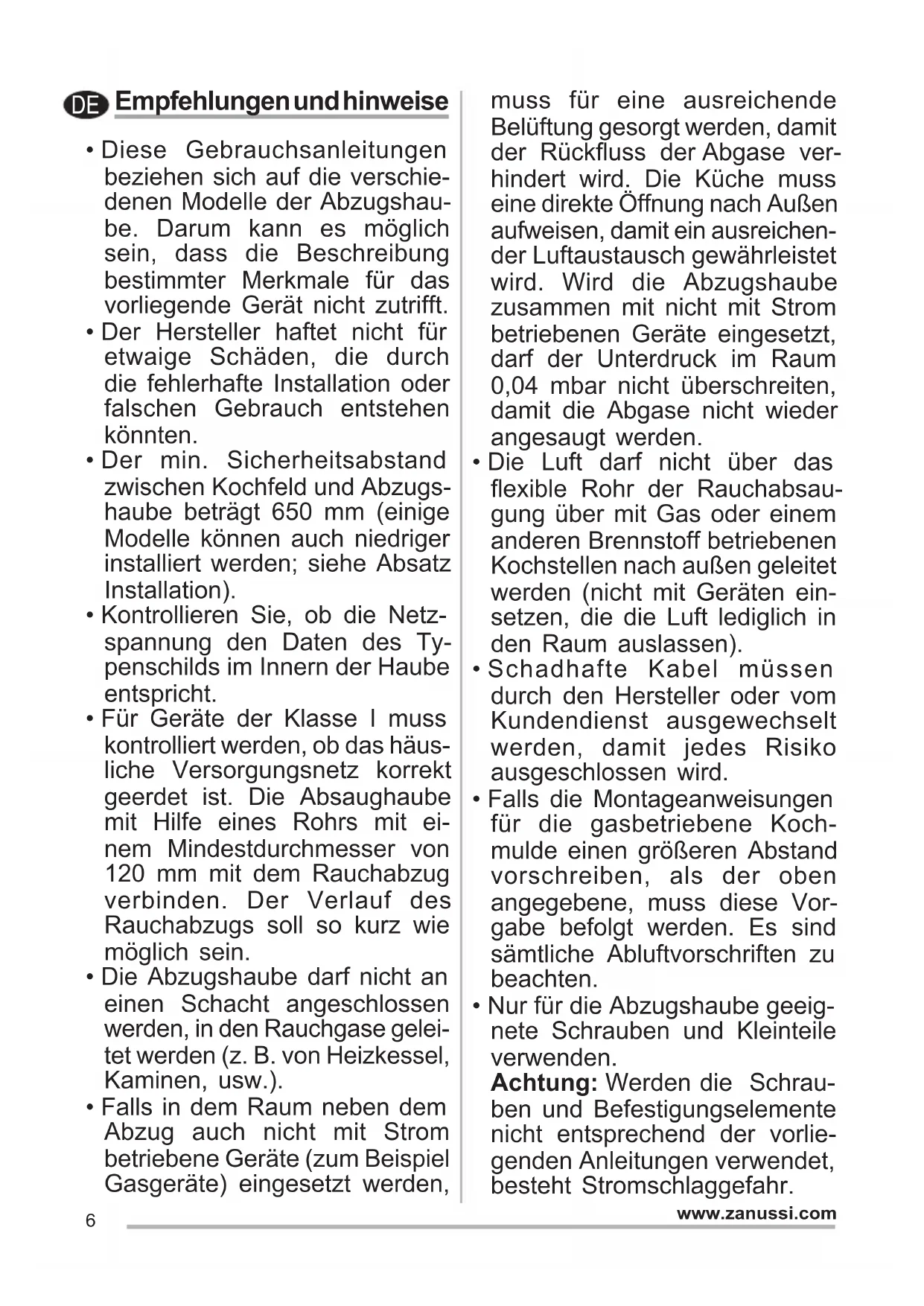 - Nur für die Abzugshaube geeig- nete Schrauben und Kleinteile verwenden. Achtung: Werden die Schrau- ben und Befestigungselemente nicht entsprechend der vorlie- genden Anleitungen verwendet, besteht Stromschlaggefahr. DE7 www.zanussi.com
